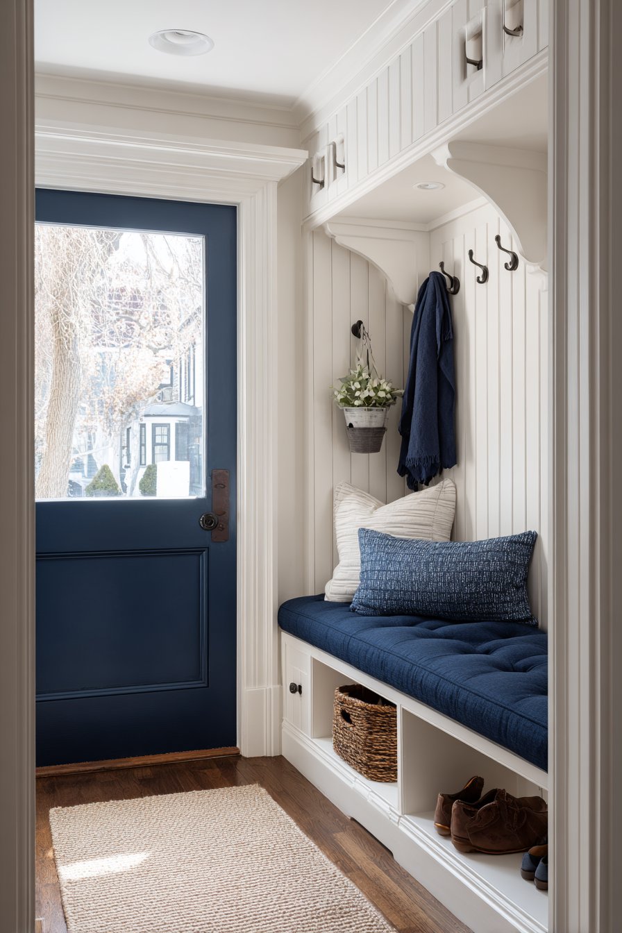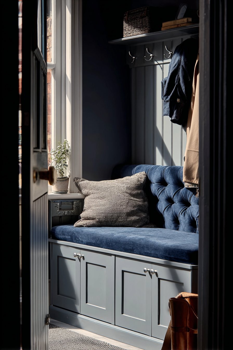 This narrow entryway demonstrates how built-in furniture can maximize functionality while adding architectural character. A built-in bench seat features a hinged top that reveals generous storage for out-of-season items like winter boots, summer sports equipment, or guest bedding. The bench cushion, upholstered in navy blue performance fabric with subtle tufting, provides comfortable seating while the durable material resists the stains and wear inevitable in high-traffic entryways.