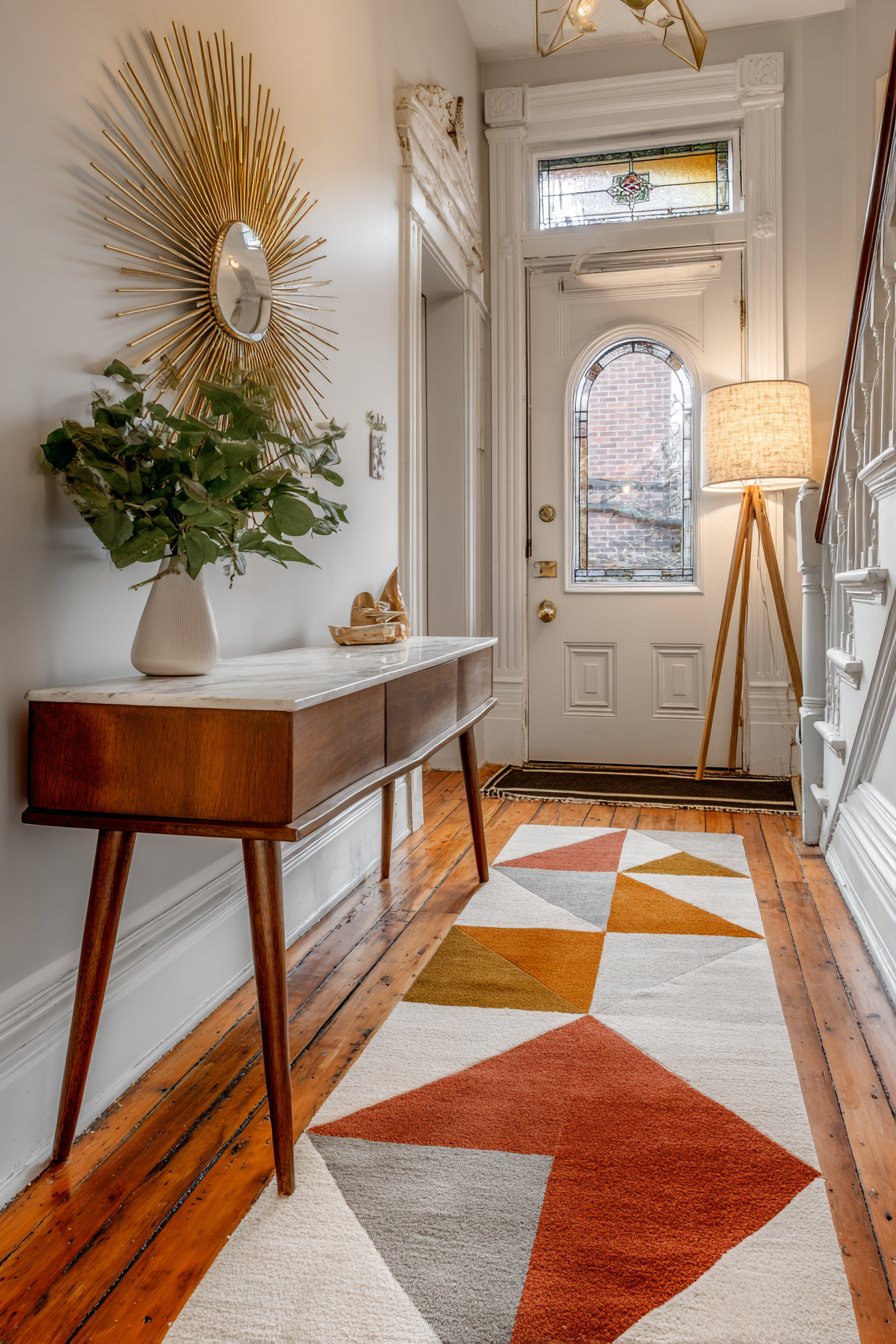 This narrow entryway channels mid-century modern design’s emphasis on clean lines, organic forms, and functional beauty. A sleek console table with angled tapered legs in warm walnut wood exemplifies the period’s furniture design principles—the tapered legs create visual lightness while the slim marble top provides practical surface space. This combination of natural wood and stone represents the mid-century appreciation for honest materials used in their most essential forms.