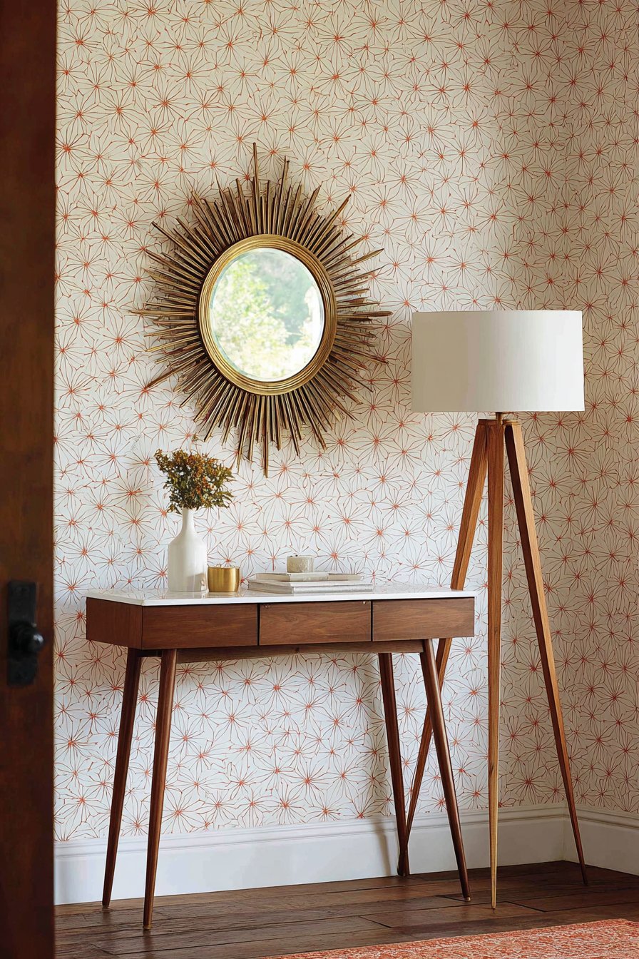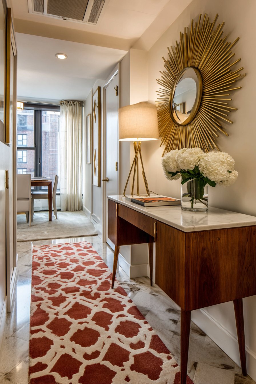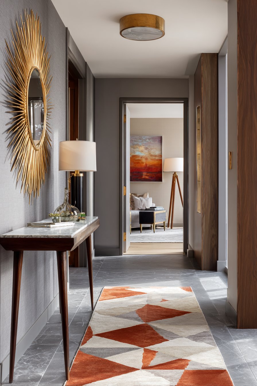 Key Design Tips: Select console tables with tapered legs and mixed materials like wood and marble for authentic mid-century modern style. Use sunburst mirrors as focal points to capture the era’s optimistic design spirit. Introduce geometric patterns through runners or textiles in period-appropriate color palettes. Choose tripod lamps to add ambient lighting while maintaining the era’s distinctive furniture forms. Coordinate warm wood tones with brass or copper metallic accents throughout the space.
