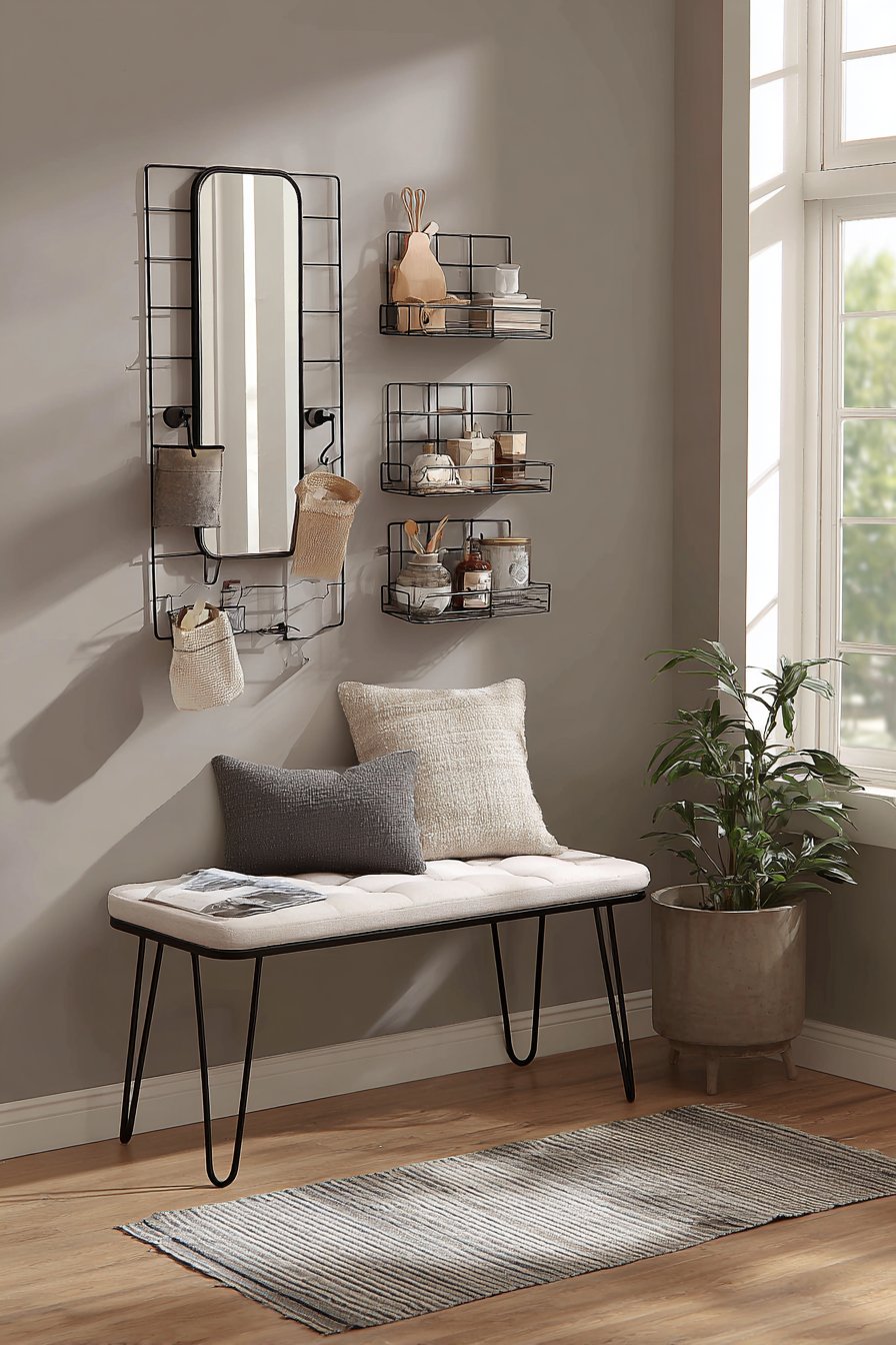 A narrow bench with hairpin legs in matte black provides seating while maintaining the space’s open, airy feel. The slender legs create minimal visual obstruction, allowing sight lines to flow through rather than stopping at a solid furniture base. The open space beneath prevents the closed-in feeling that can occur with solid-based furniture in tight quarters, while the bench’s narrow depth preserves essential walkway clearance.