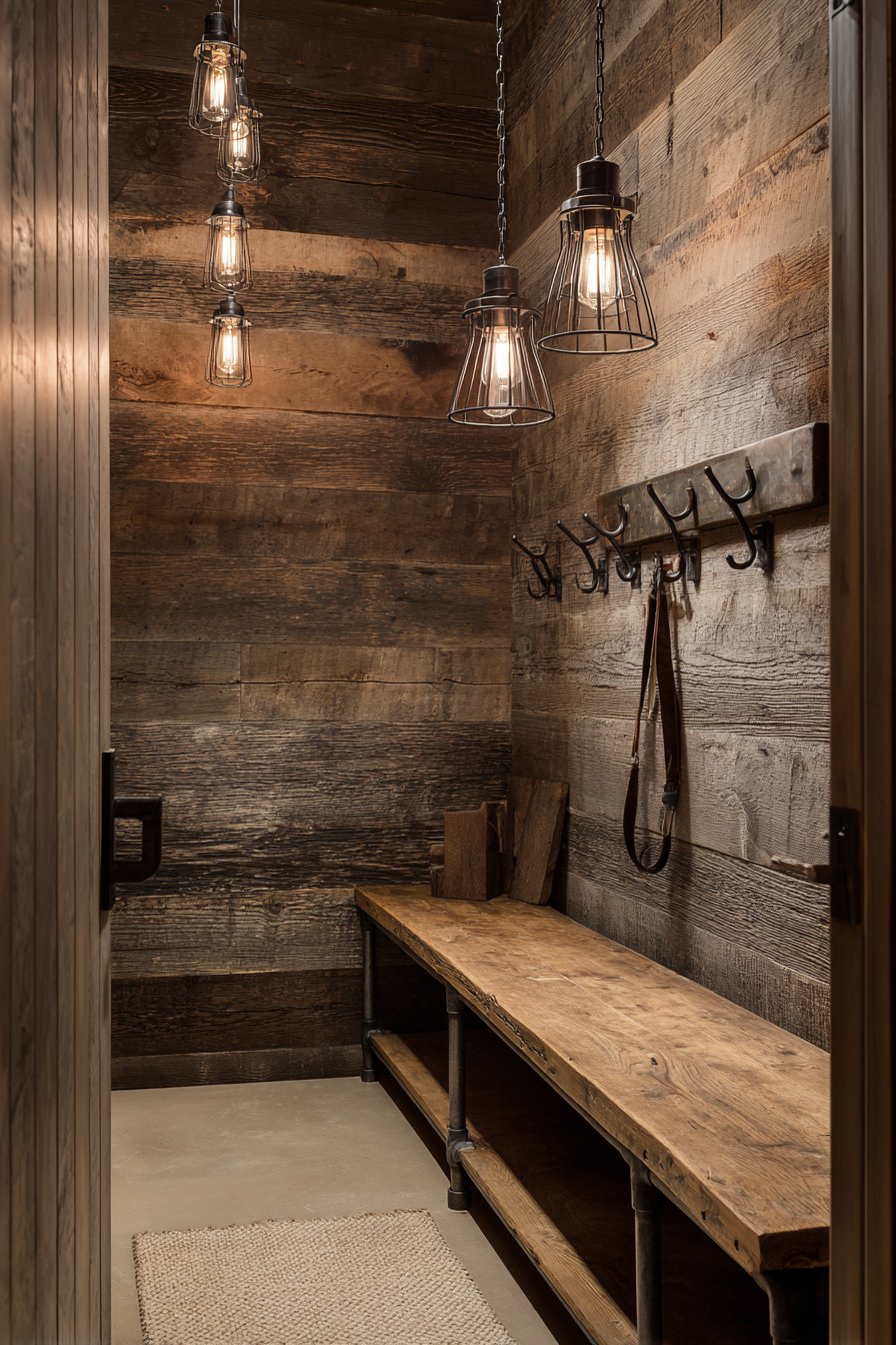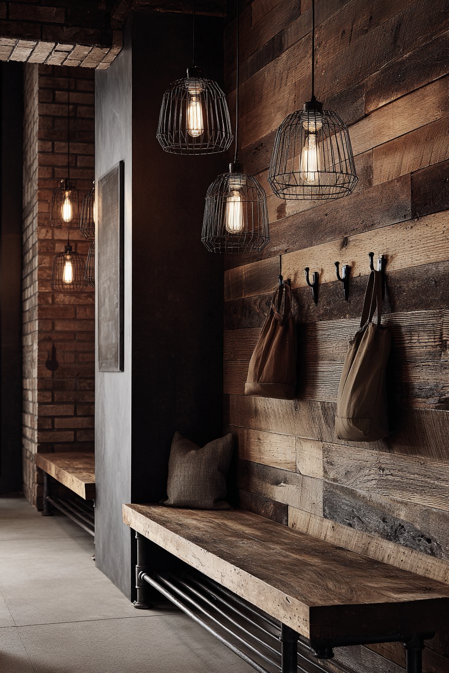 Key Design Tips: Source authentic reclaimed barn wood for accent walls to add genuine character and historical patina. Mount large iron or metal hooks directly into substantial wood for rustic functionality and aesthetic. Combine wood elements with metal pipe furniture legs to create industrial-rustic material combinations. Choose Edison bulbs in cage fixtures for period-appropriate lighting that adds warmth and ambiance. Embrace natural wood imperfections like knots and color variations as design features rather than flaws.
