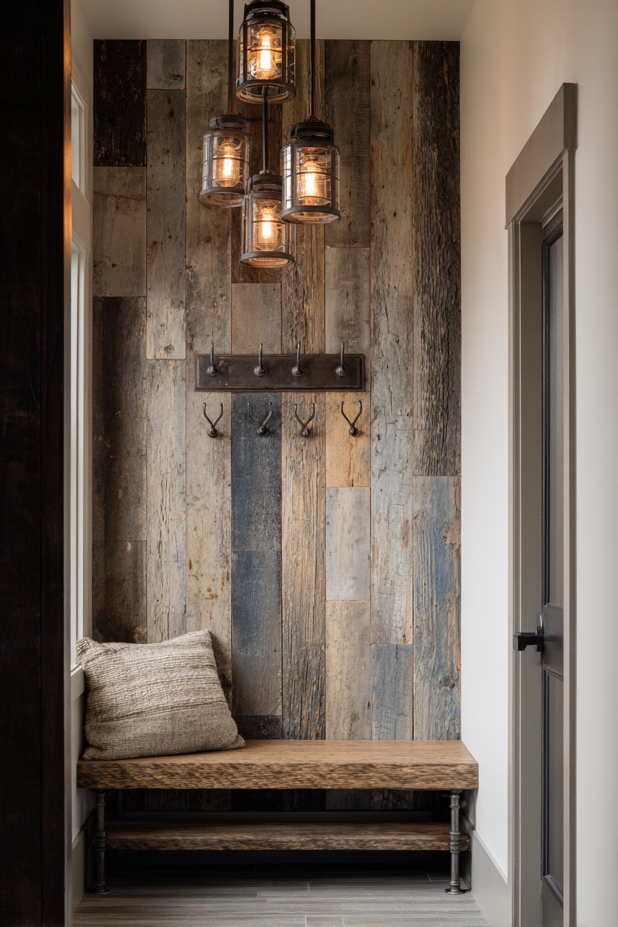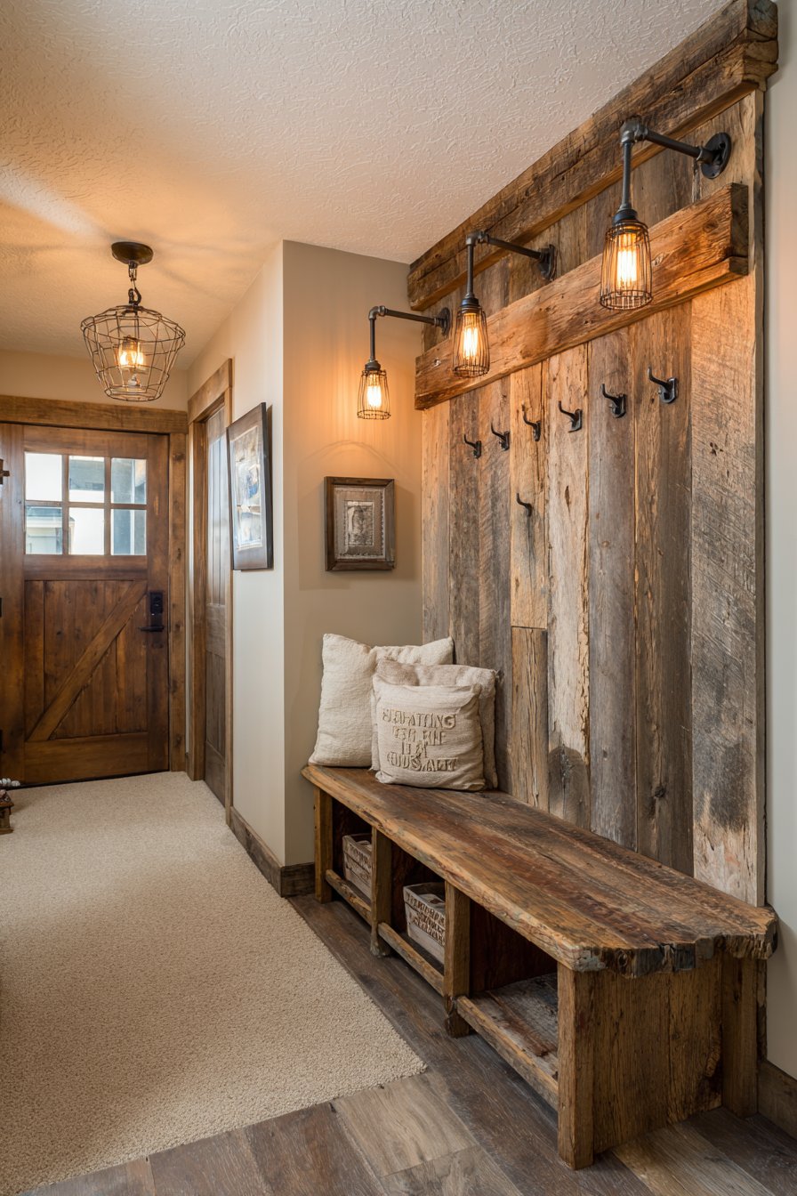 This narrow entryway celebrates rustic design through the use of authentic reclaimed materials that bring history and character to the space. Reclaimed barn wood planks cover one wall as an accent treatment, their weathered surfaces showing the patina of decades of exposure to the elements. Each plank tells a story through nail holes, color variation, and surface texture—imperfections that become beautiful in the rustic design philosophy. Large iron hooks mount directly into the substantial wood, their oversized scale and rough finish complementing the rugged aesthetic.