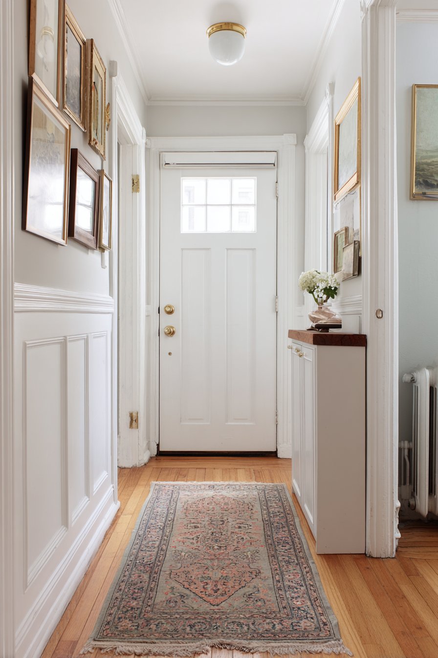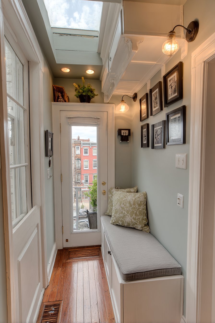 This narrow entryway transforms one long wall into a personal art gallery through carefully arranged frames of varying sizes and styles. The gallery wall creates visual interest and personality without requiring any floor space—proving that vertical surfaces offer prime real estate in narrow corridors. Strategic spacing between frames prevents the wall from feeling cluttered or overwhelming, maintaining breathing room that’s essential in tight quarters.