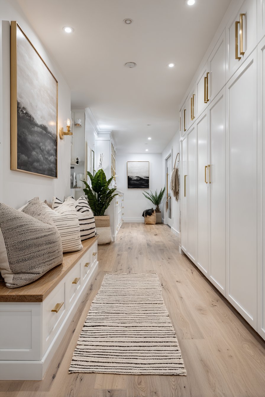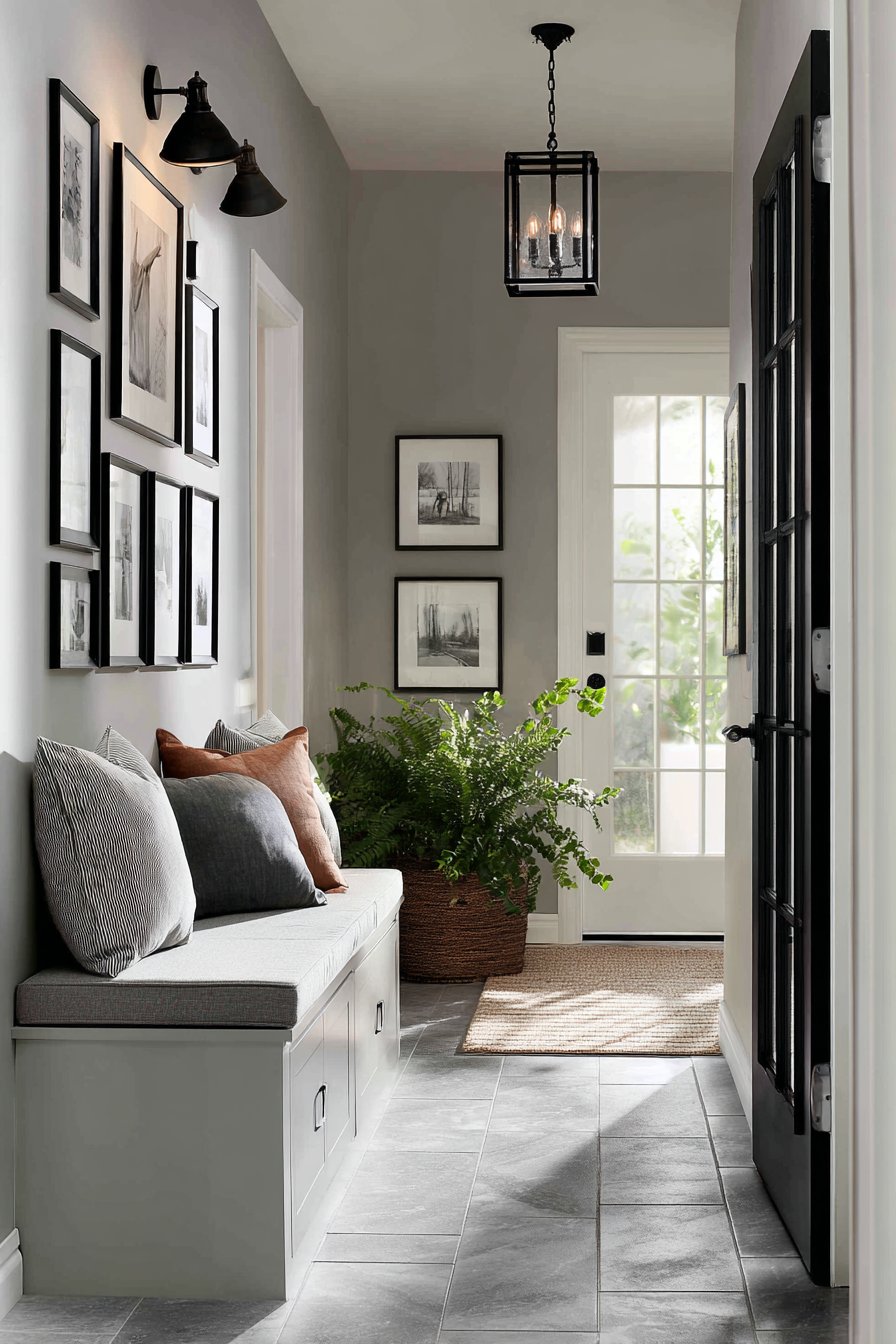 Above the bench, a carefully curated gallery wall transforms what could be dead space into a personal showcase of family memories. Black frames in matching styles create visual unity while the personal photographs within add warmth and personality. The gallery arrangement is strategically planned to create visual interest without protruding into the limited walkway—each frame carefully positioned to maintain the flow of traffic while drawing the eye upward, emphasizing vertical space rather than the corridor’s narrowness.
