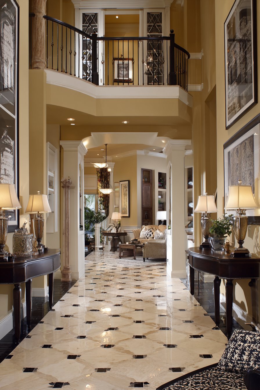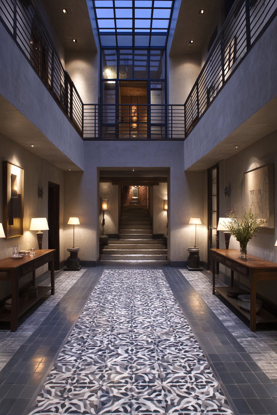 Key Design Tips: Use symmetrical furniture placement to create visual balance and formal order in narrow entryways. Install matching wall-mounted cabinets at upper levels to add storage without reducing floor space. Choose glass-front cabinet doors to display organized contents while containing clutter. Select matching lighting pairs to reinforce symmetrical composition and provide balanced illumination. Center runners with medallion or symmetrical patterns to emphasize the design axis and guide movement.