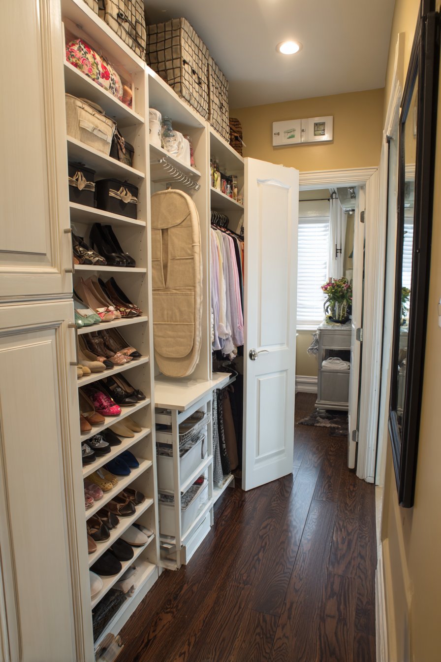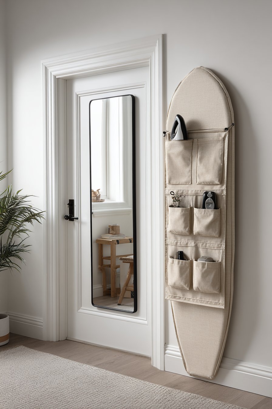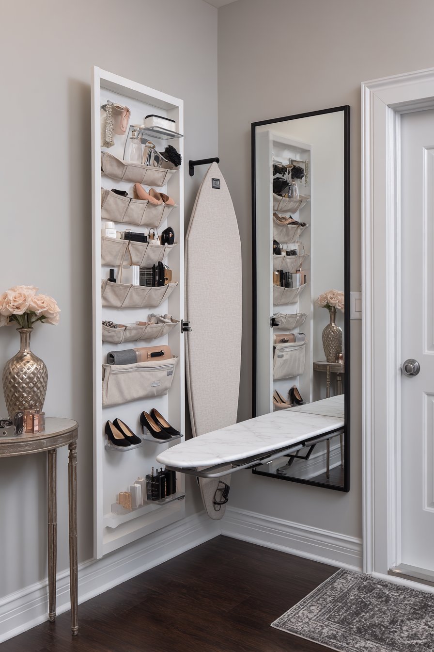 Key Design Tips: Utilize over-the-door organizers to capture unused door-back surface for storage without consuming floor or wall space. Conceal occasional-use items like ironing boards behind cabinet doors to keep them accessible but invisible. Choose natural canvas organizers that soften the look of visible storage solutions. Install full-length mirrors to serve both functional and space-expanding purposes. Select simple black frames for mirrors to add definition without visual heaviness.