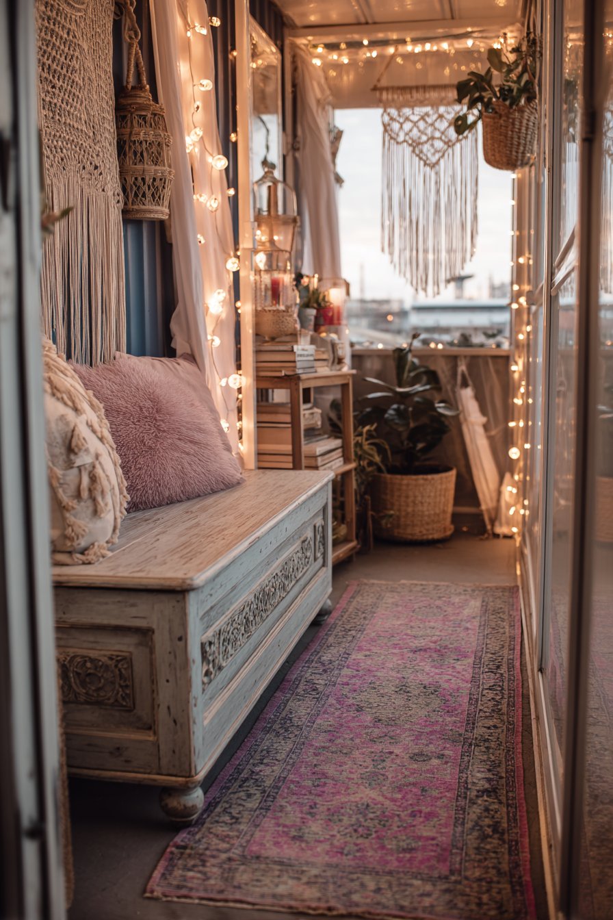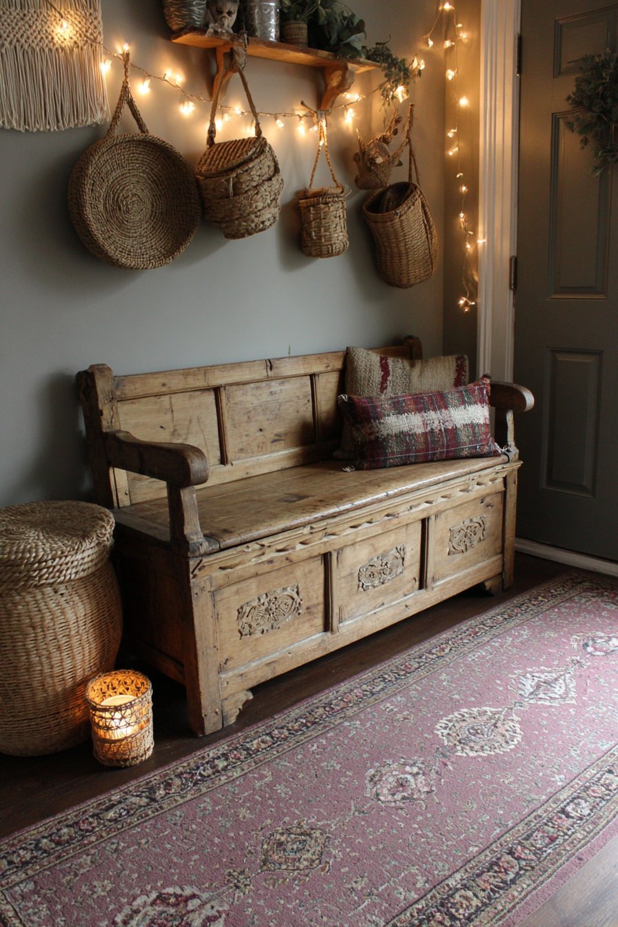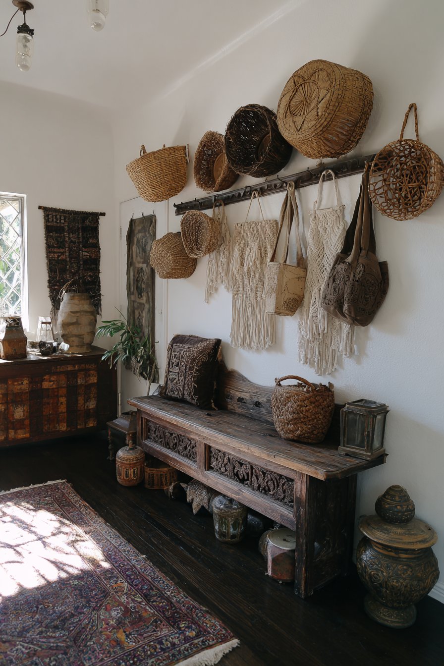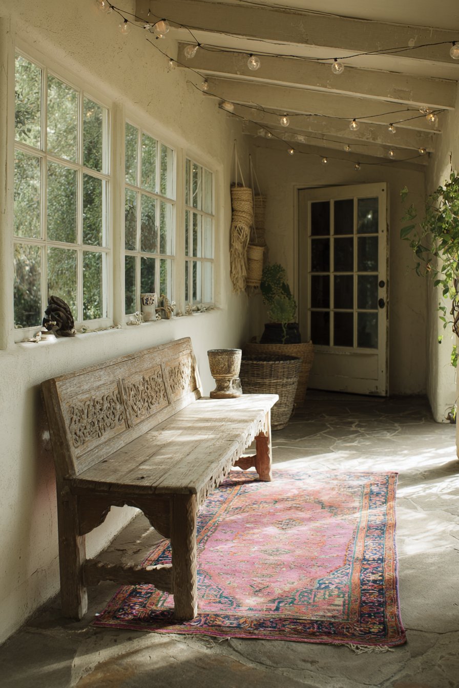 This narrow entryway embraces bohemian design’s love of collected elements, varied textures, and global influences. A vintage wooden bench featuring carved details and worn paint patina serves as the seating element, its aged appearance suggesting a piece with history and stories. The imperfect paint wear reveals layers of color beneath, creating the authentic vintage look that cannot be replicated through distressing new pieces.