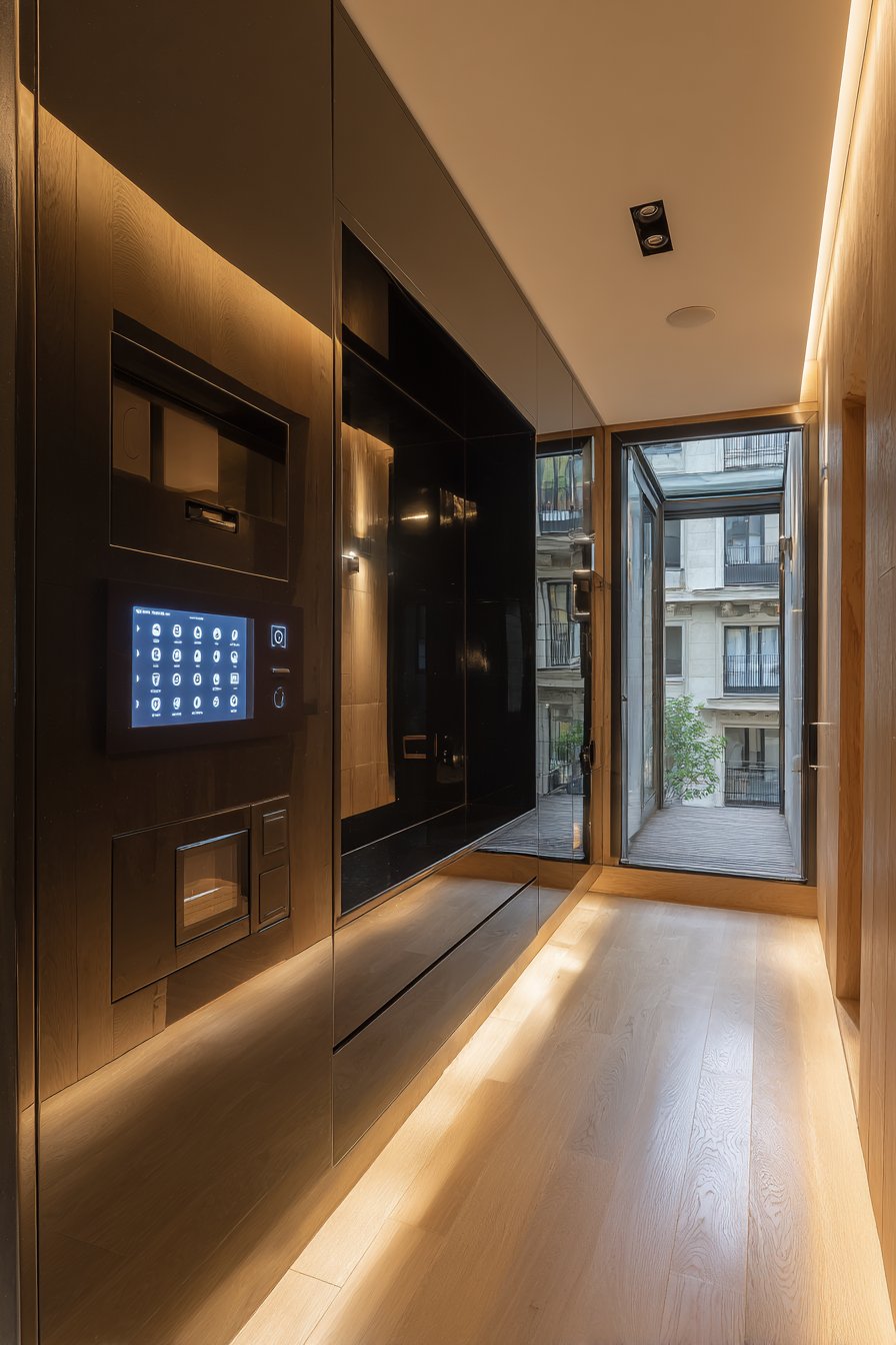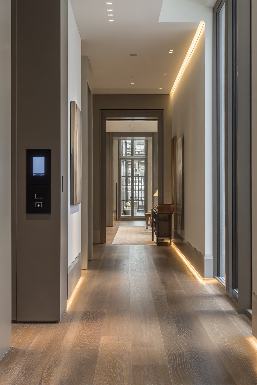 This narrow entryway represents the intersection of design and technology through thoughtful smart home integration. A wall-mounted tablet controls lighting, locks, and security systems, integrated into a sleek black panel that maintains clean aesthetic while providing comprehensive home control. The centralized interface means all home systems can be managed from the entryway—perfect for last-minute adjustments before leaving or immediate control upon arriving.