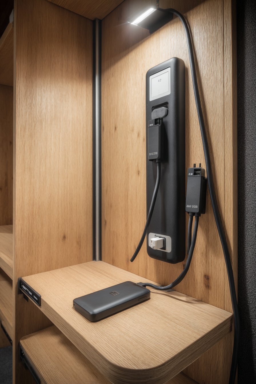 Below the control panel, a charging station built into a slim console keeps devices organized and powered. Multiple USB ports and wireless charging surfaces accommodate various device types while cable management systems keep cords contained and invisible. This dedicated charging zone prevents the counter clutter that occurs when devices charge in random locations throughout the home.