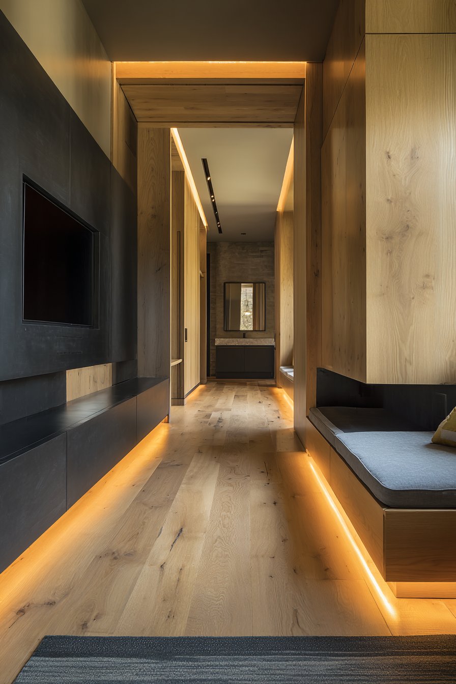 Motion-sensor LED strips along the baseboards provide automatic pathway lighting that activates when someone approaches. This thoughtful feature eliminates fumbling for light switches in the dark while adding a modern, sophisticated lighting element that requires no manual operation. Professional interior photography showcases these tech-forward solutions within clean modern aesthetic, demonstrating how technology can enhance functionality without compromising design integrity.