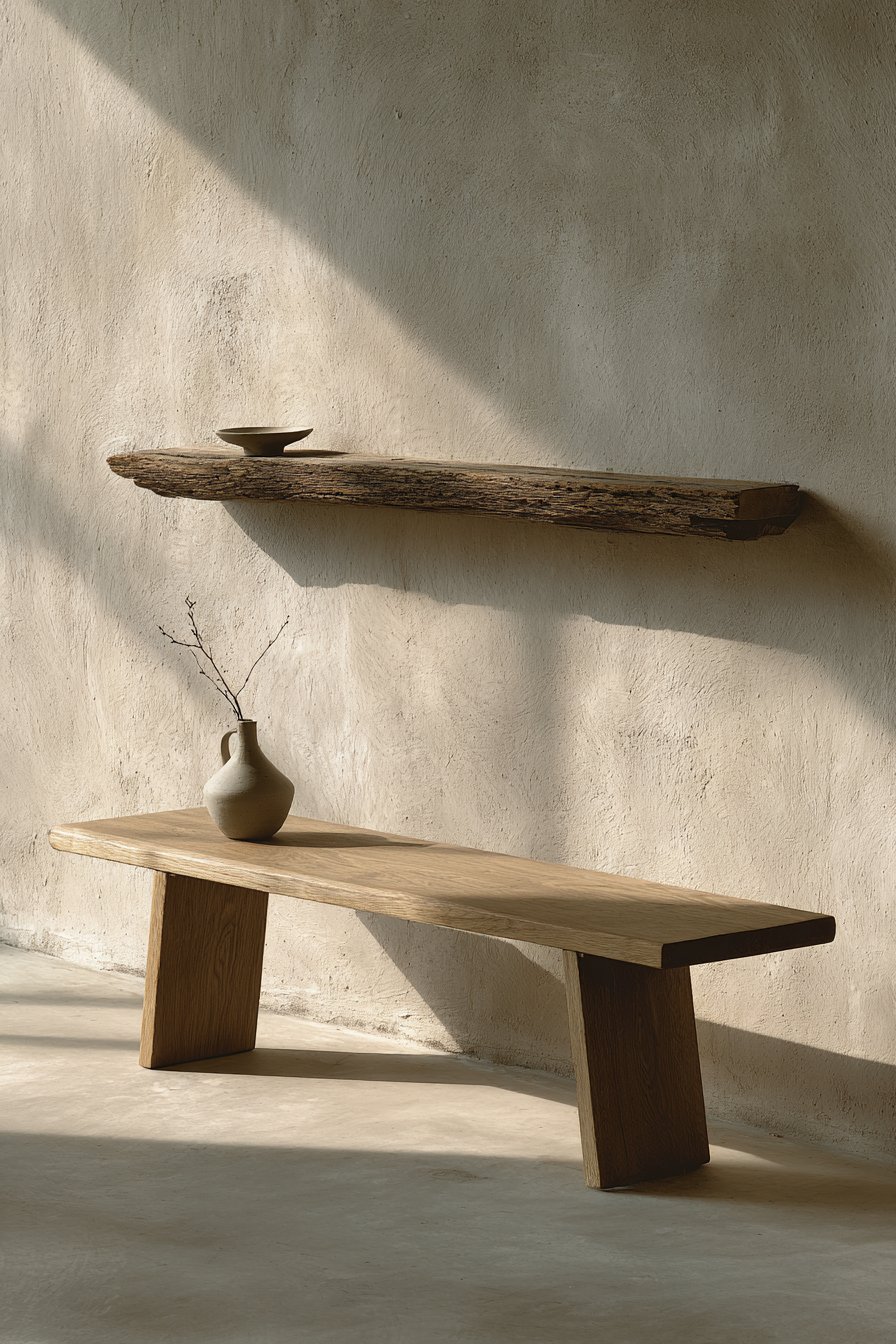 Key Design Tips: Choose low platform benches in natural light woods for Japanese-inspired calm and grounded presence. Eliminate visible hardware and construction details to achieve pure, simple forms. Display minimal objects with intentional placement that respects negative space as design element. Select natural ash or light woods that highlight grain patterns and natural beauty. Use single-stem flower arrangements to bring nature indoors with restraint and elegance.