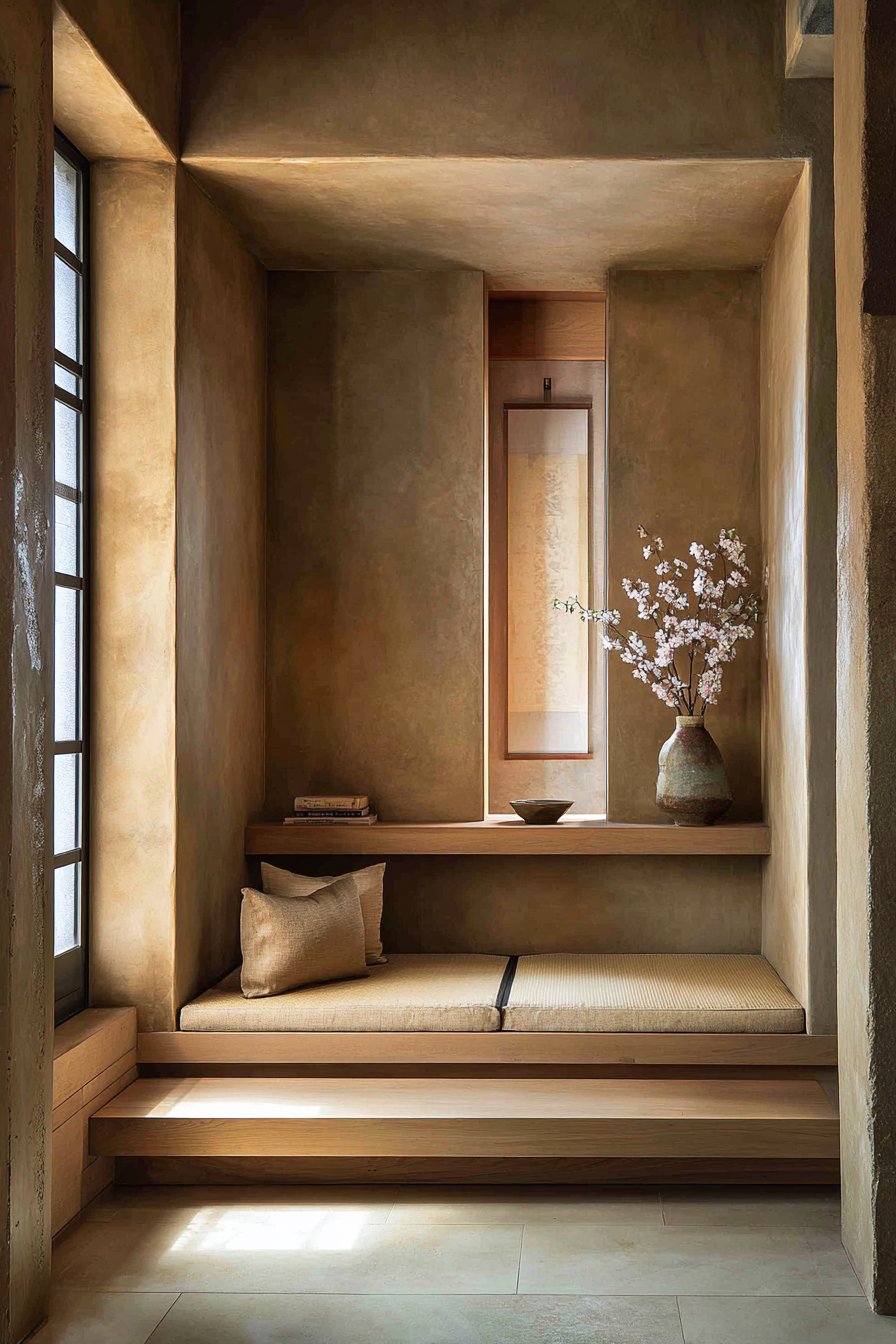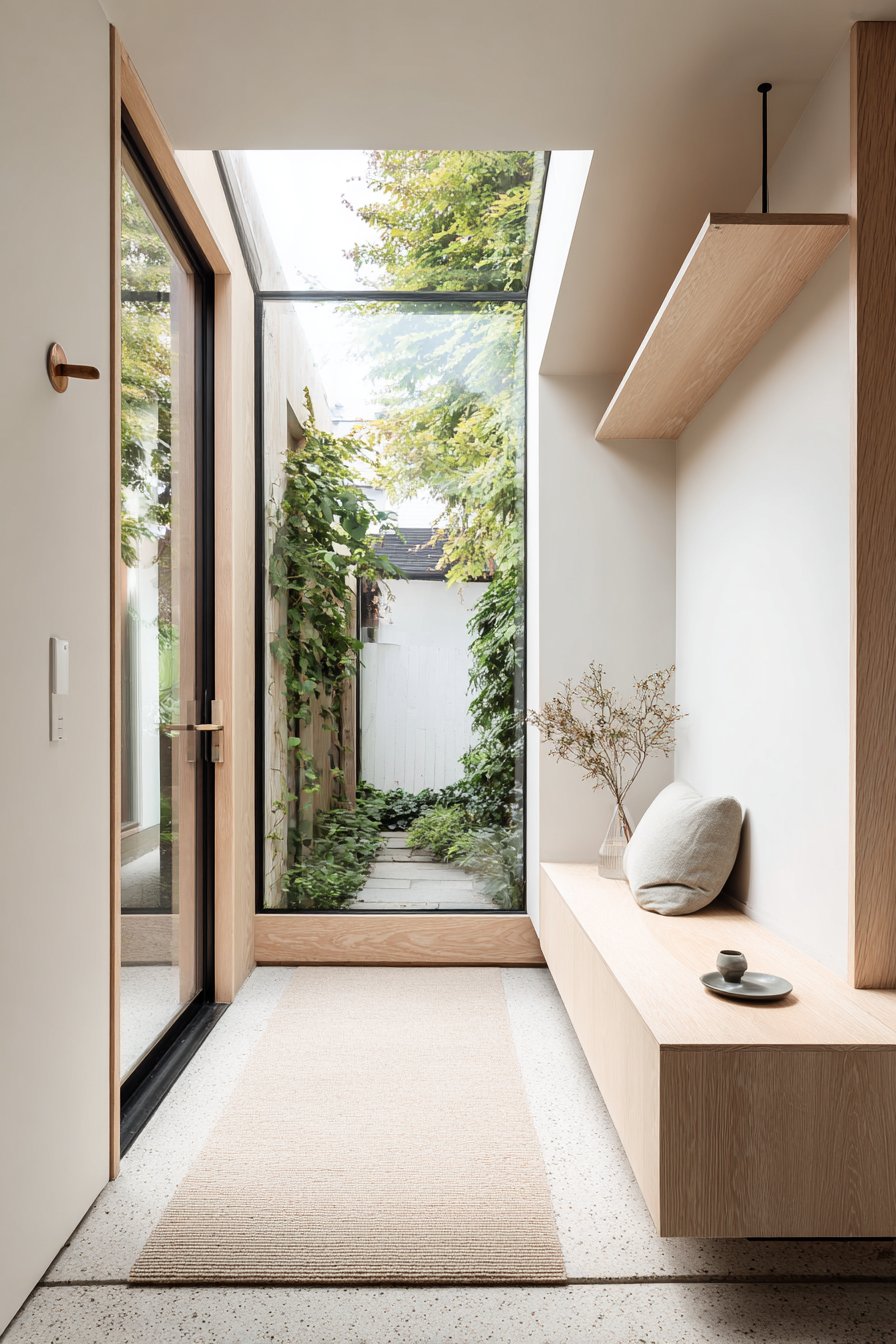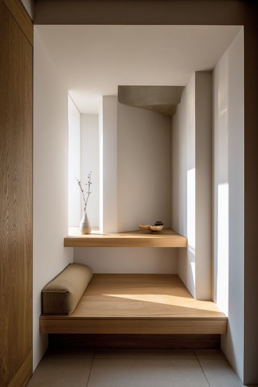 This narrow entryway channels Japanese design principles of restraint, natural materials, and intentional emptiness. A low platform bench in natural ash with simple lines and no visible hardware exemplifies the Japanese appreciation for pure form and honest construction. The bench sits close to the floor, creating a grounded, stable presence that encourages the mindful transition between outside and inside—the entryway as threshold deserving ritualistic respect.