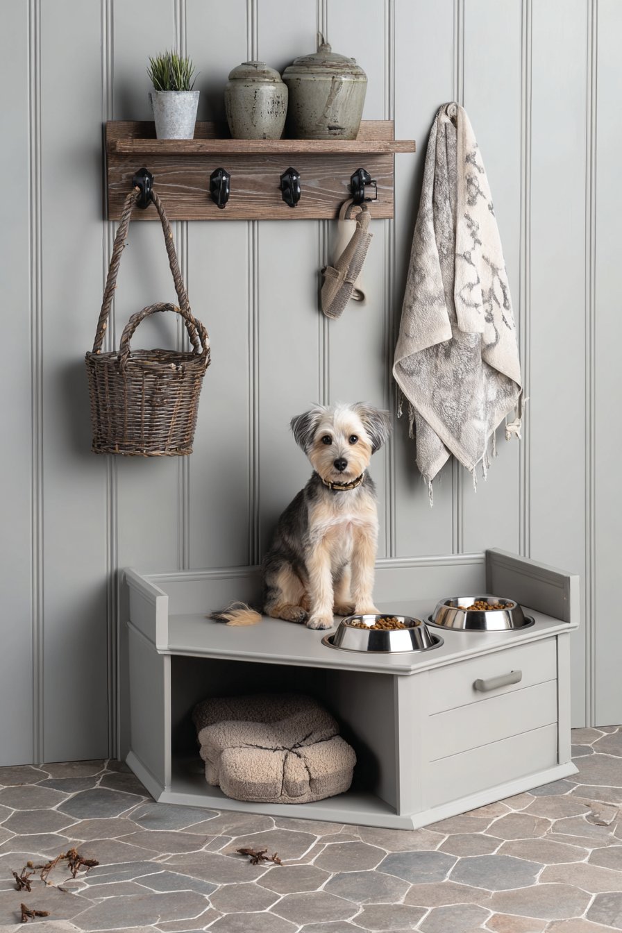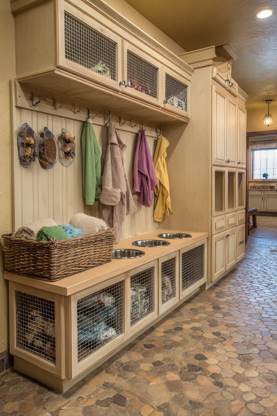 Key Design Tips: Install pull-out pet feeding stations that conceal when not in use to maintain clean walkways and organized appearance. Create dedicated low storage for pet supplies including leashes, toys, and grooming items. Select durable, water-resistant flooring materials that withstand muddy paws and frequent cleaning. Position wall-mounted hooks for pet towels at convenient heights near the entry door. Choose tile flooring with sealed surfaces for easy cleanup of tracked-in dirt and moisture.