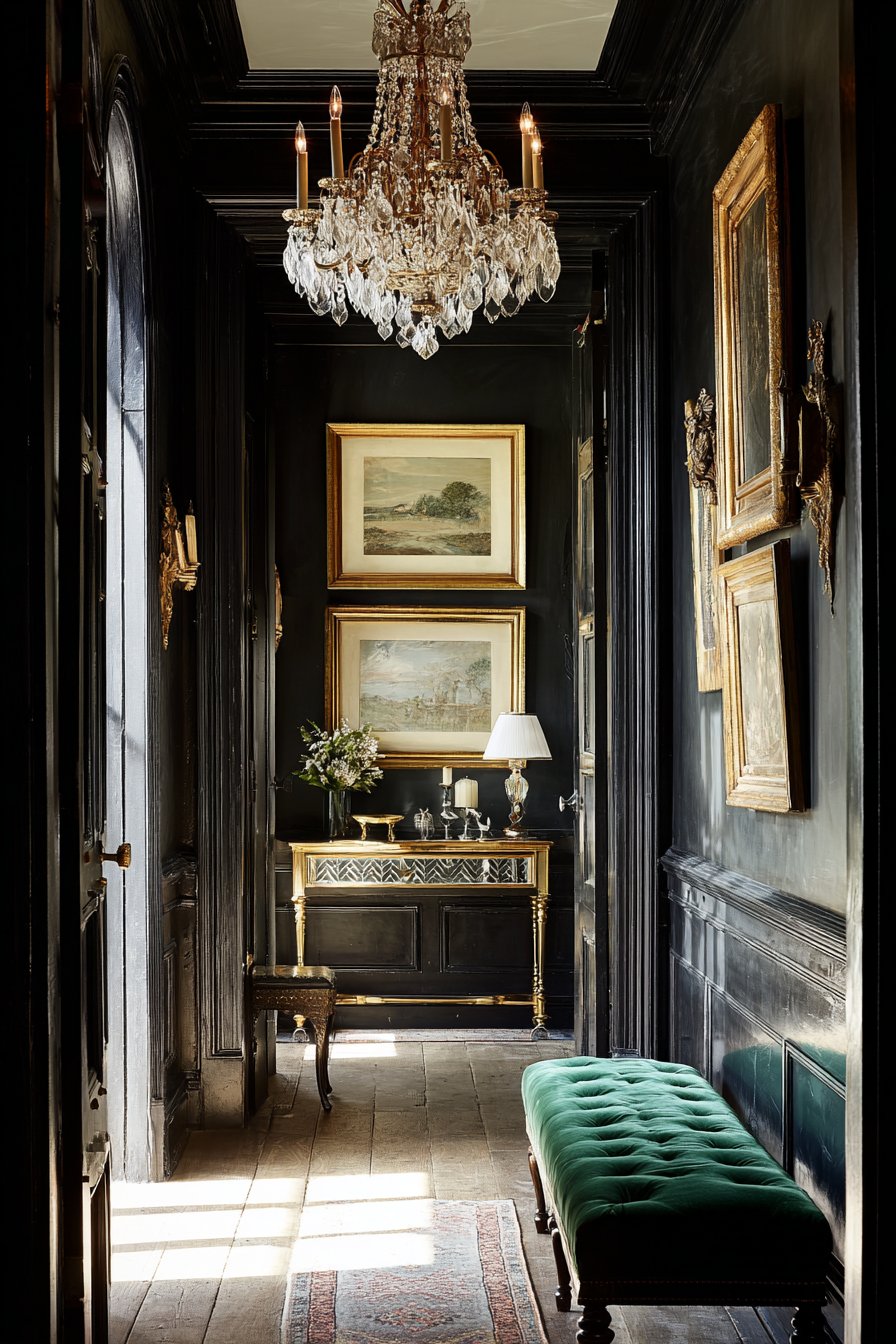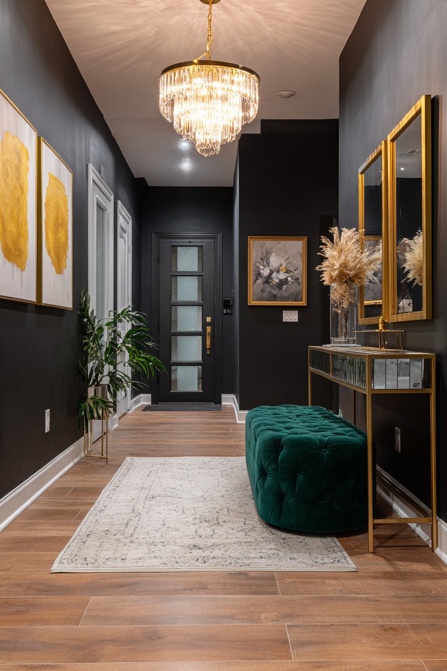 A statement chandelier with crystal accents serves as the jewelry of the space, its prismatic elements catching and scattering light throughout the narrow corridor. A plush velvet ottoman in emerald green provides jewel-tone contrast, its rich color singing against the black walls while its sumptuous fabric invites touch. Professional interior photography captures this bold approach with dramatic lighting that emphasizes luxury details and the interplay between dark surfaces and reflective elements.