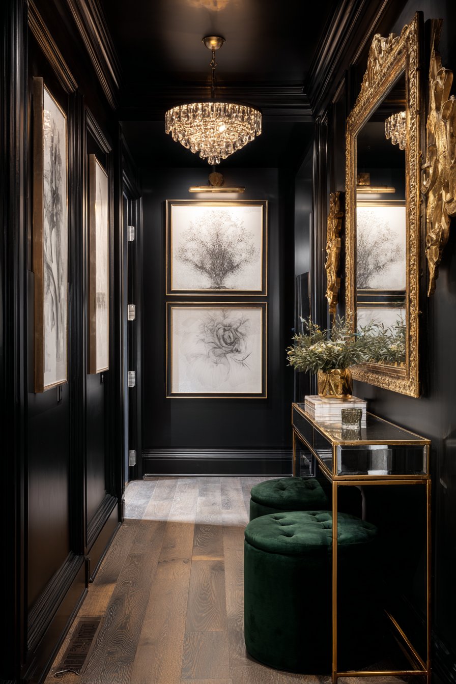 This narrow entryway proves that small spaces don’t always require light colors, demonstrating how dramatic choices can create intimate, sophisticated atmospheres. Black walls create enveloping ambiance that transforms the narrow corridor from potential liability into intentional drama. This bold choice works because metallic and reflective elements bounce light throughout the space, preventing it from feeling like a dark tunnel.
