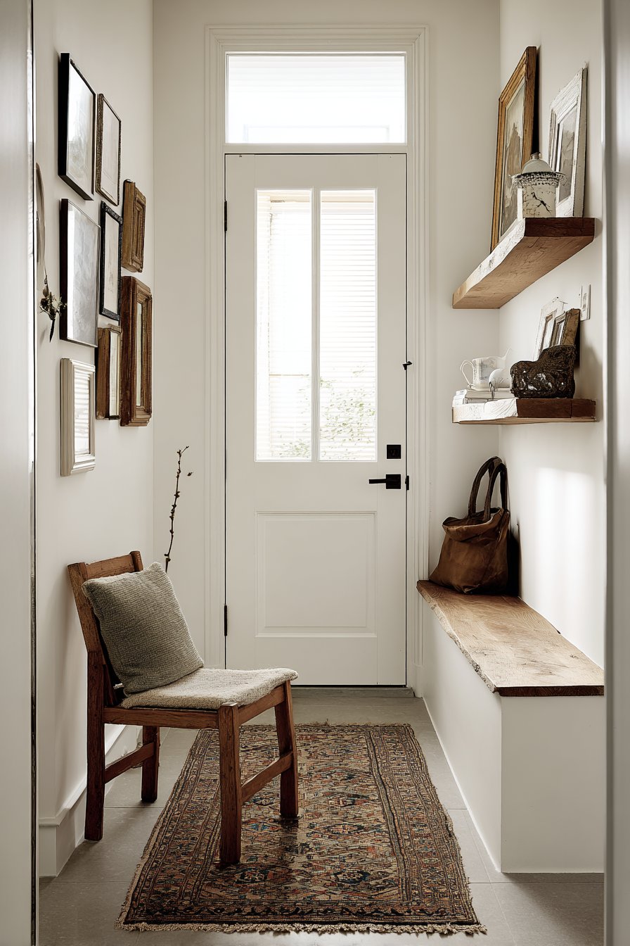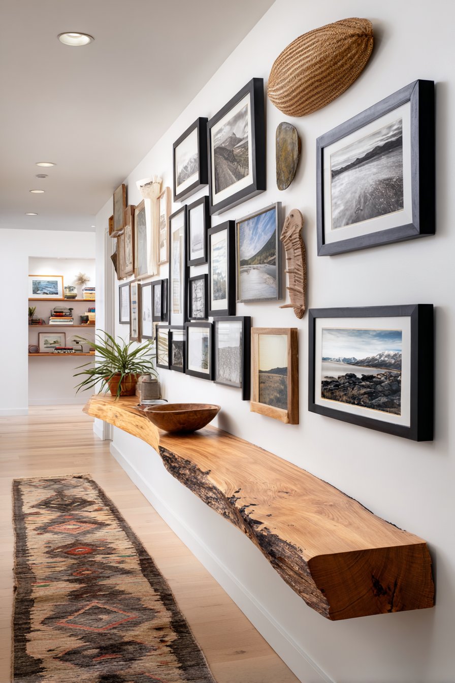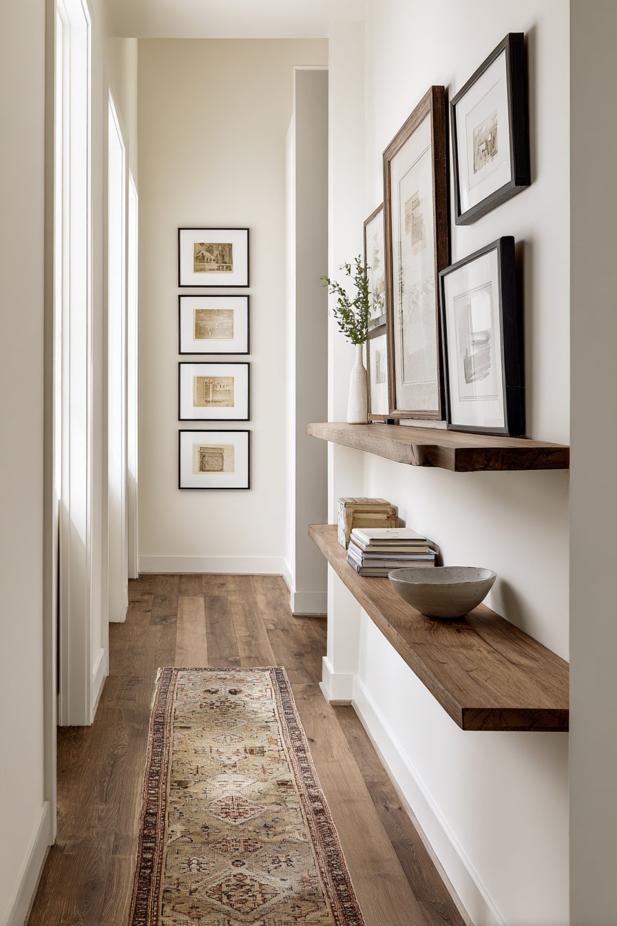 Key Design Tips: Create gallery walls with strategic spacing between frames to maintain visual breathing room in narrow corridors. Mix frame sizes and styles for collected-over-time authenticity rather than overly matched uniformity. Balance detailed gallery walls with minimal opposite walls to prevent visual overwhelming. Use live-edge wood shelving to add organic beauty and textural contrast to formal framed art. Choose vintage runners with muted colors that complement rather than compete with wall displays.