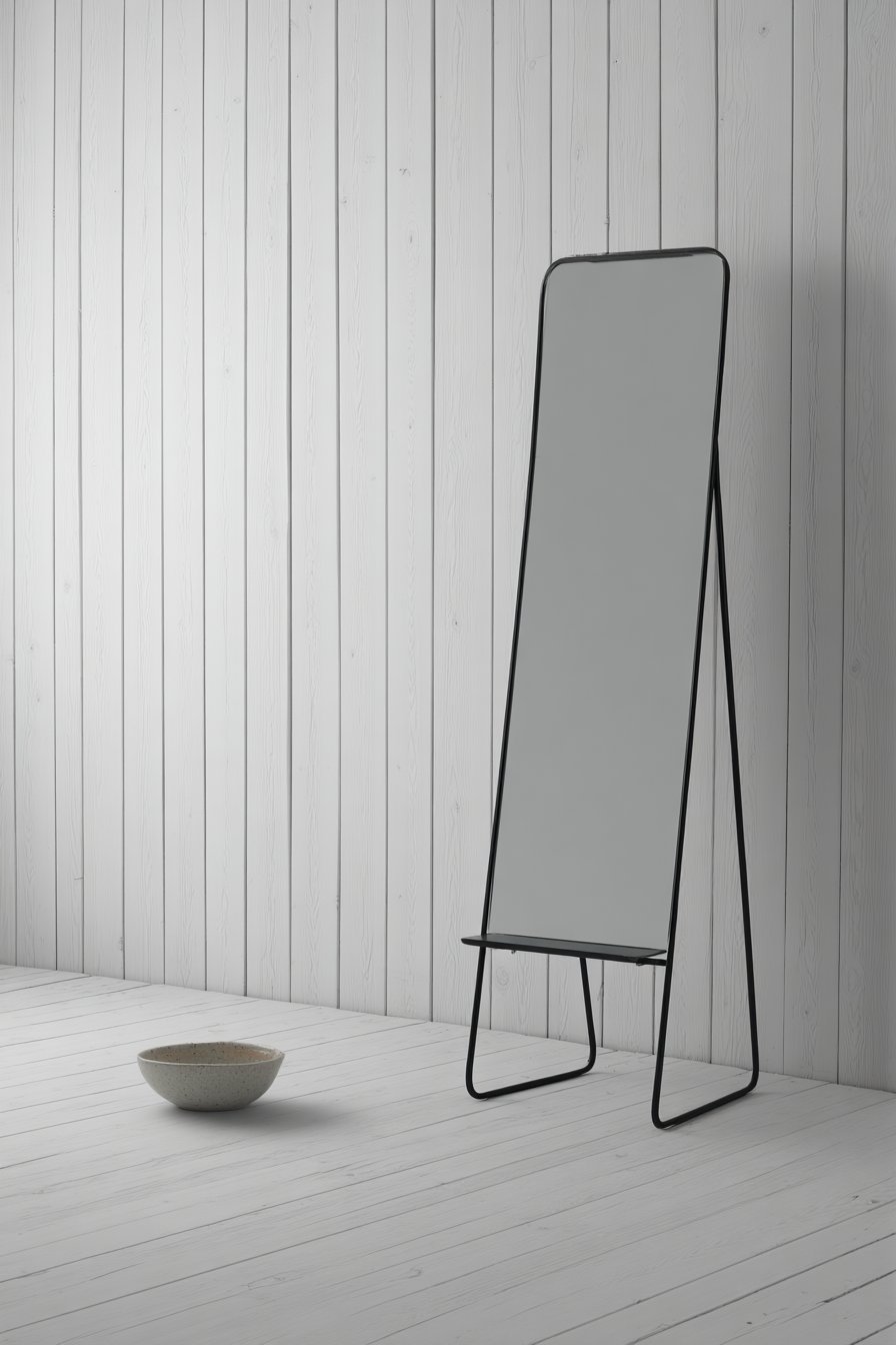 A full-length mirror with a simple black frame mounts to the remaining wall space, providing the functionality of a last-minute appearance check while visually expanding the space through reflection. The mirror’s slim black frame adds graphic definition without consuming significant visual space or competing with other elements. Interior photography demonstrates how these space-saving solutions work together to provide comprehensive functionality within an extremely limited footprint.