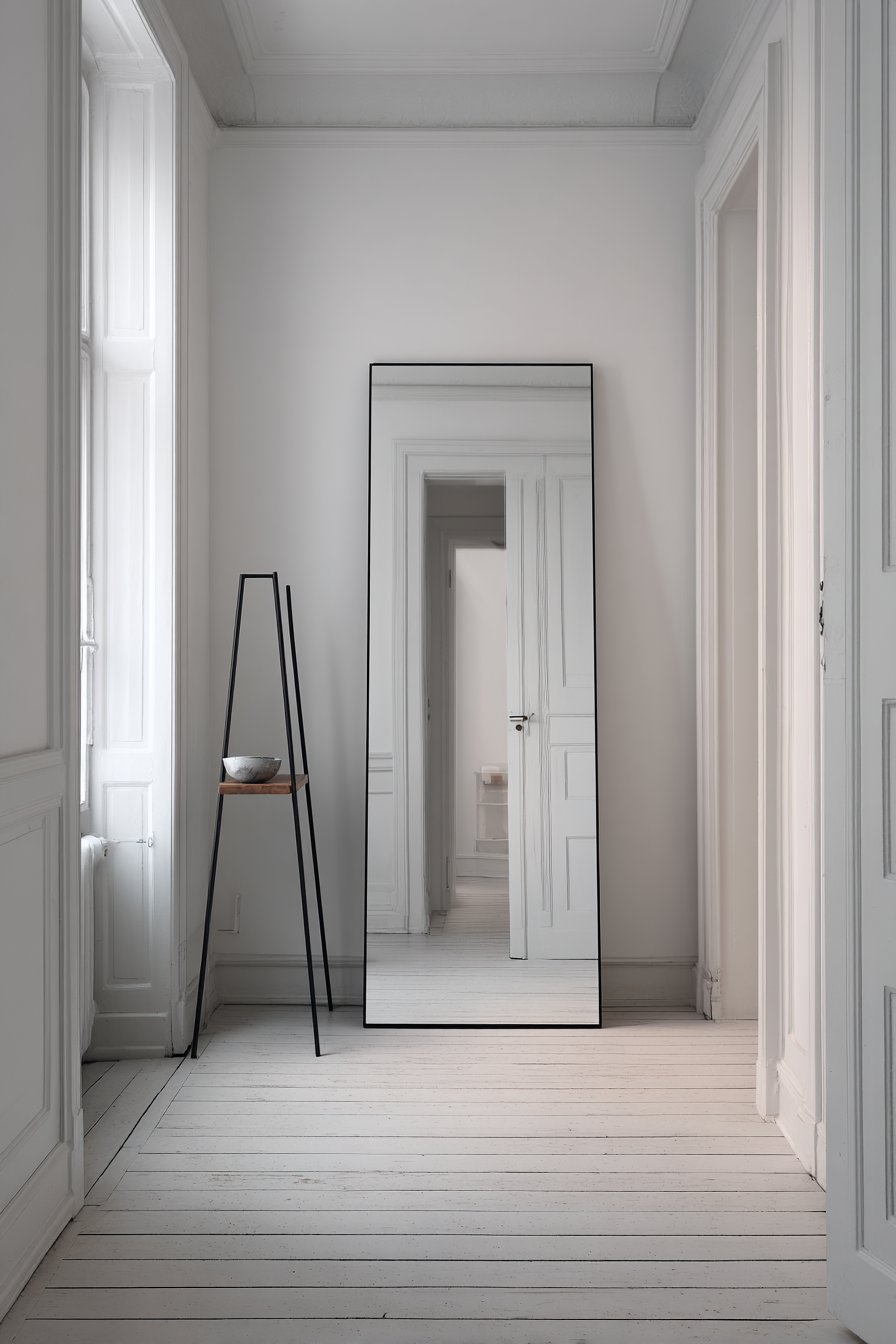 This narrow entryway embraces the minimalist philosophy that less is more, creating an exercise in restraint that yields maximum visual impact. A floor-to-ceiling mirror leans casually against one wall, its substantial presence serving a crucial design function—doubling the perceived depth of the space through reflection. This simple addition transforms a potentially claustrophobic two-and-a-half-foot-wide corridor into a visually expansive entry that feels open and breathable.