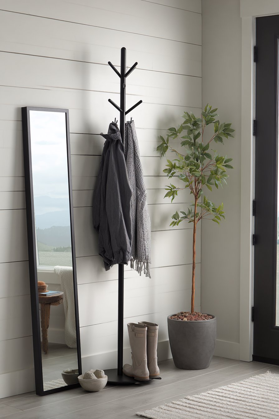 Opposite the mirror, a single streamlined coat rack in matte black metal provides essential functionality without cluttering the space. Its slender profile and vertical orientation make it nearly invisible when not in use, yet it offers multiple hanging points for daily essentials. A small ceramic bowl rests on a narrow ledge, creating a designated catch-all for keys, mail, and other pocket items—proof that even the smallest surfaces can serve important organizational functions.