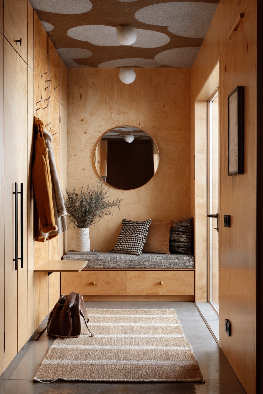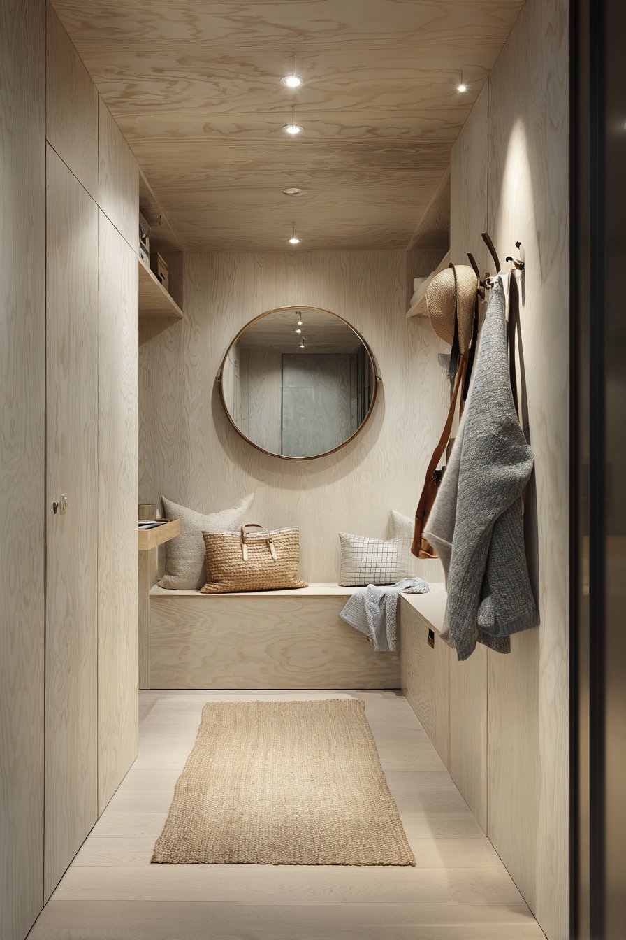 Key Design Tips: Install pegboard systems for ultimate storage flexibility that adapts to changing seasonal and daily needs. Paint pegboards in colors that complement your decor scheme rather than leaving them natural wood or standard gray. Balance detailed storage on one wall with minimal treatment on the opposite wall to prevent visual overwhelming. Choose light wood tones for seating to minimize visual weight in small spaces. Use round convex mirrors for maximum field-of-view expansion in narrow corridors.