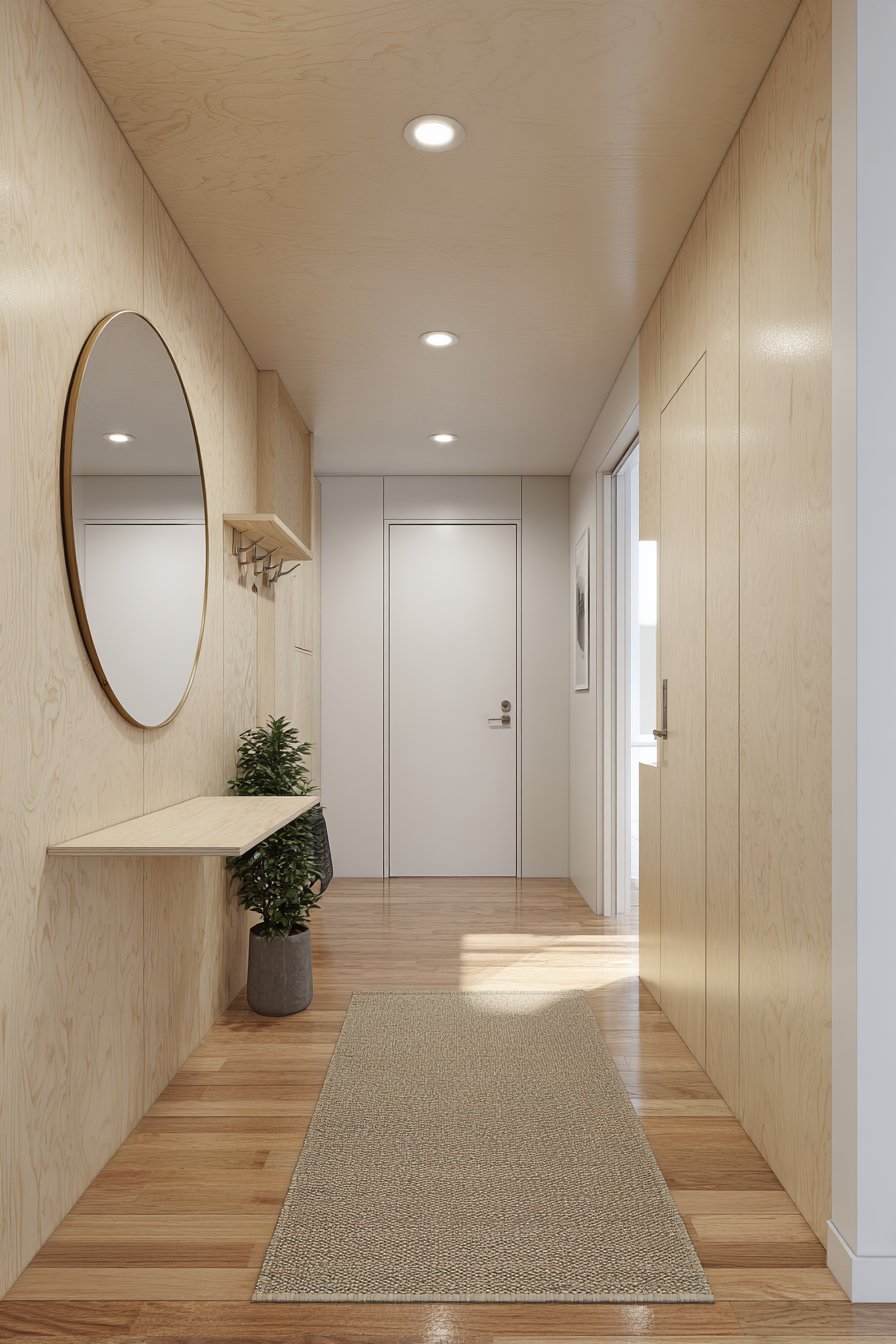 Underfoot, a simple jute runner protects the flooring while adding organic texture that grounds the design. Recessed lighting eliminates the need for space-consuming lamps or fixtures, providing even illumination that highlights the natural beauty of the birch wood and creates no visual clutter. The overall composition demonstrates how thoughtful Scandinavian design can make narrow spaces feel both functional and serene.