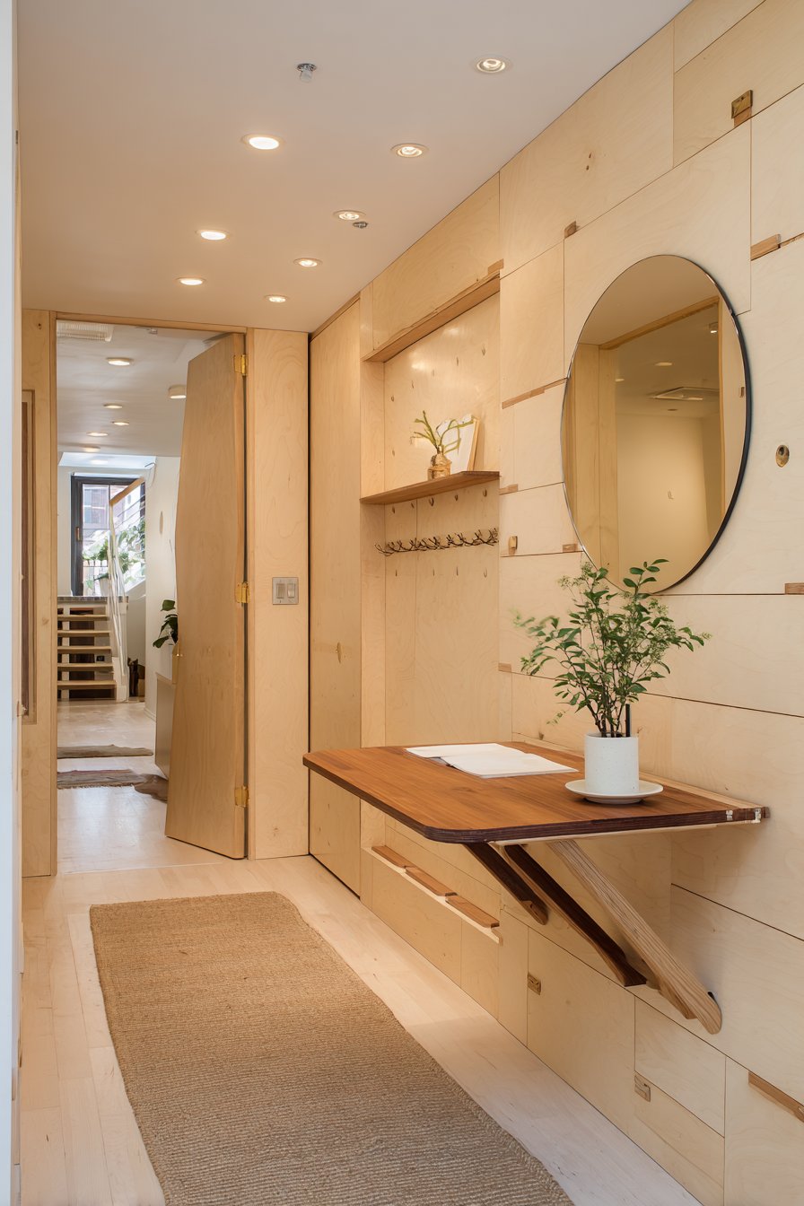This narrow entryway embodies Scandinavian design principles—functionality, simplicity, and natural materials combine to create a space that’s both beautiful and supremely practical. Light birch wood elements throughout establish the characteristic Nordic aesthetic, their pale honey tones bringing warmth without darkness. The centerpiece is a wall-mounted drop-leaf table that demonstrates ingenious space-saving design—when folded up, it presents a clean, unobtrusive profile; when dropped down, it provides a convenient surface for setting down bags, sorting mail, or staging items going in and out of the home.