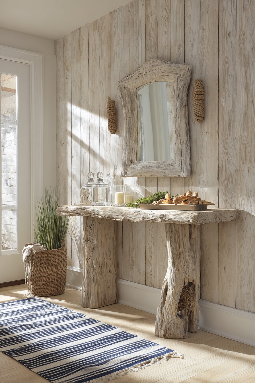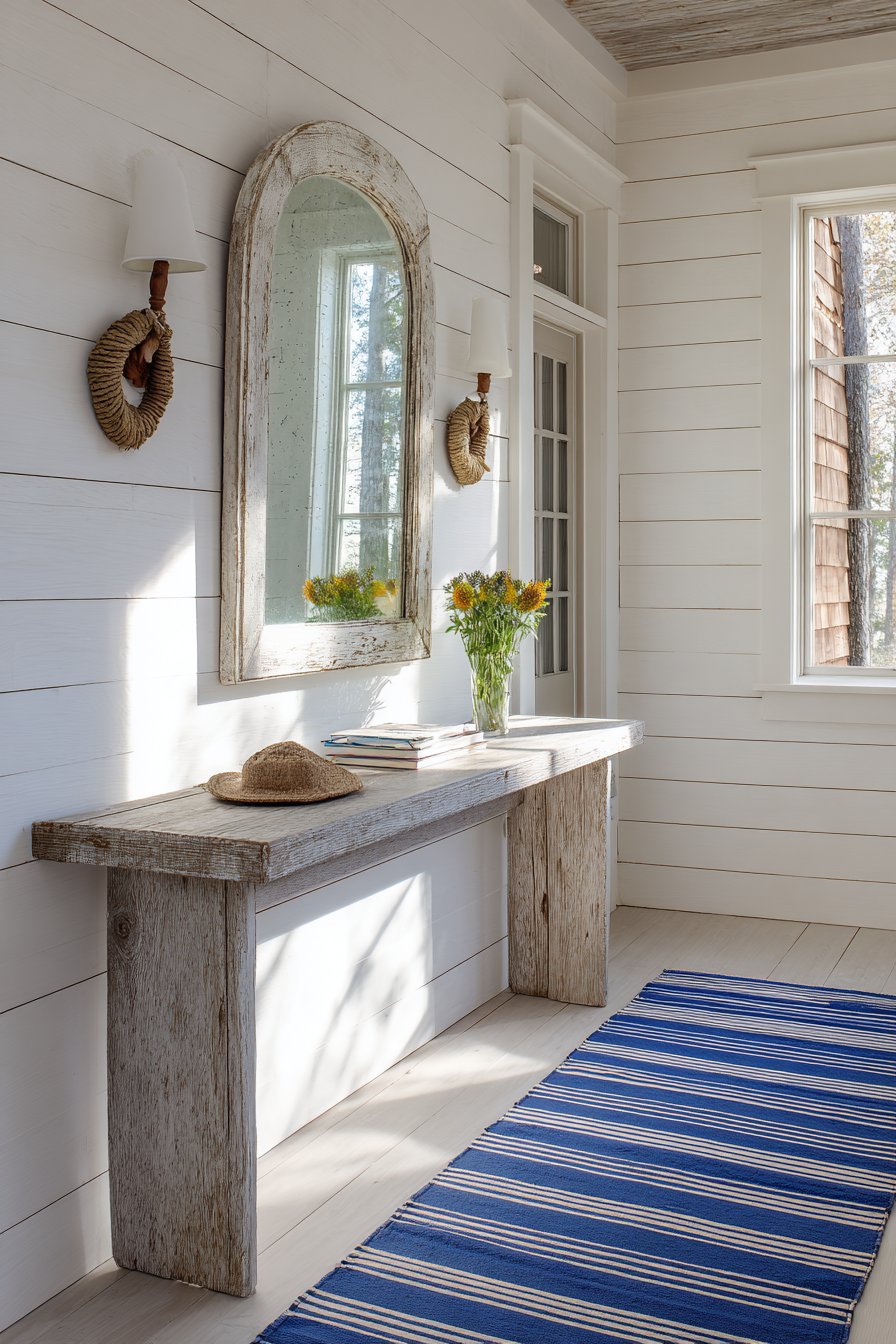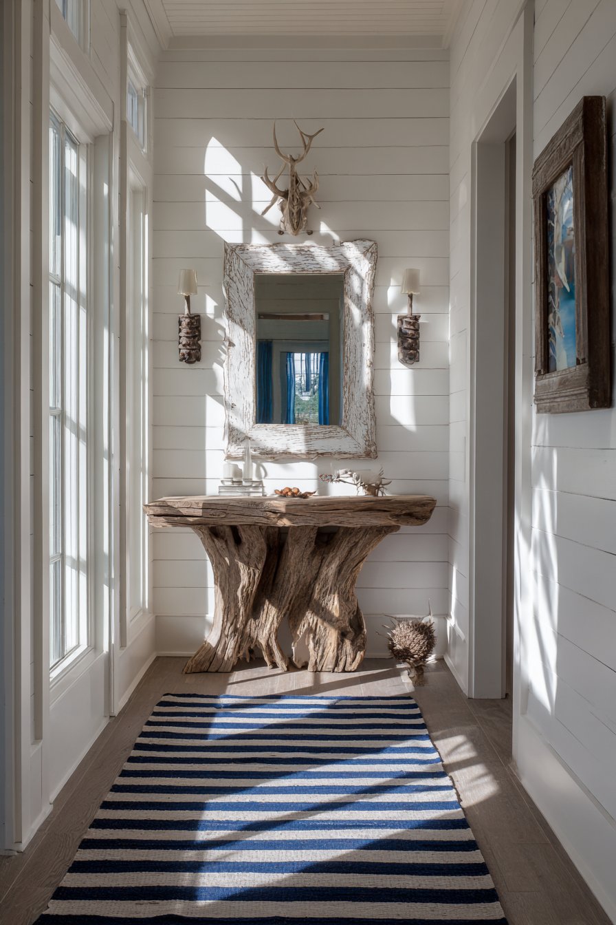 A striped cotton runner in navy and white grounds the space underfoot, its classic pattern introducing visual movement that guides visitors through the narrow corridor. The runner’s durable cotton construction suits the high-traffic nature of entryways while its nautical stripes maintain the cohesive coastal theme. Natural afternoon light filters through, highlighting the silvery tones of the driftwood console and creating the bright, airy atmosphere essential to coastal design.