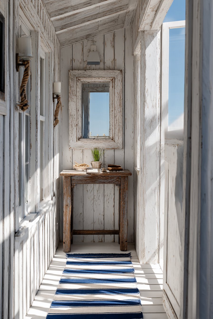 Key Design Tips: Use whitewashed or painted shiplap to add texture while maintaining brightness in narrow coastal entryways. Select furniture with weathered or driftwood finishes to add instant character and coastal authenticity. Incorporate rope or nautical elements in lighting fixtures to reinforce the theme without overwhelming the space. Choose striped runners in classic navy and white to add pattern while maintaining a clean aesthetic. Position mirrors to reflect natural light and visually expand the narrow space.