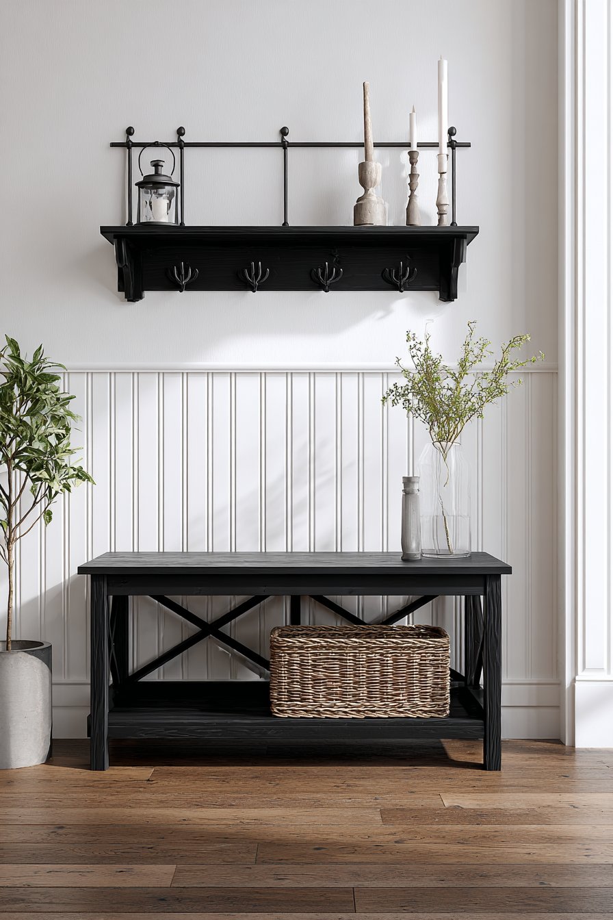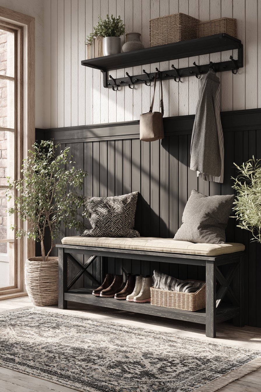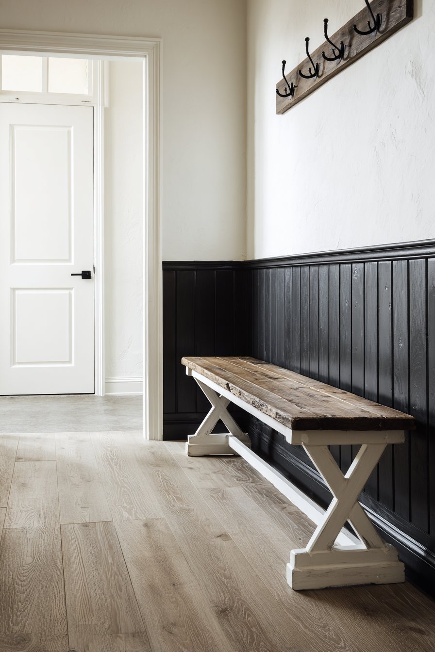 This narrow entryway perfectly captures the modern farmhouse aesthetic that balances rustic charm with contemporary clean lines. Black board-and-batten wainscoting covers the lower half of the walls, creating dramatic contrast against crisp white upper walls. This two-tone approach adds architectural interest while the vertical lines of the batten visually heighten the space, drawing the eye upward and away from the narrow footprint.