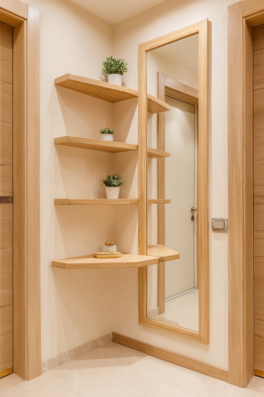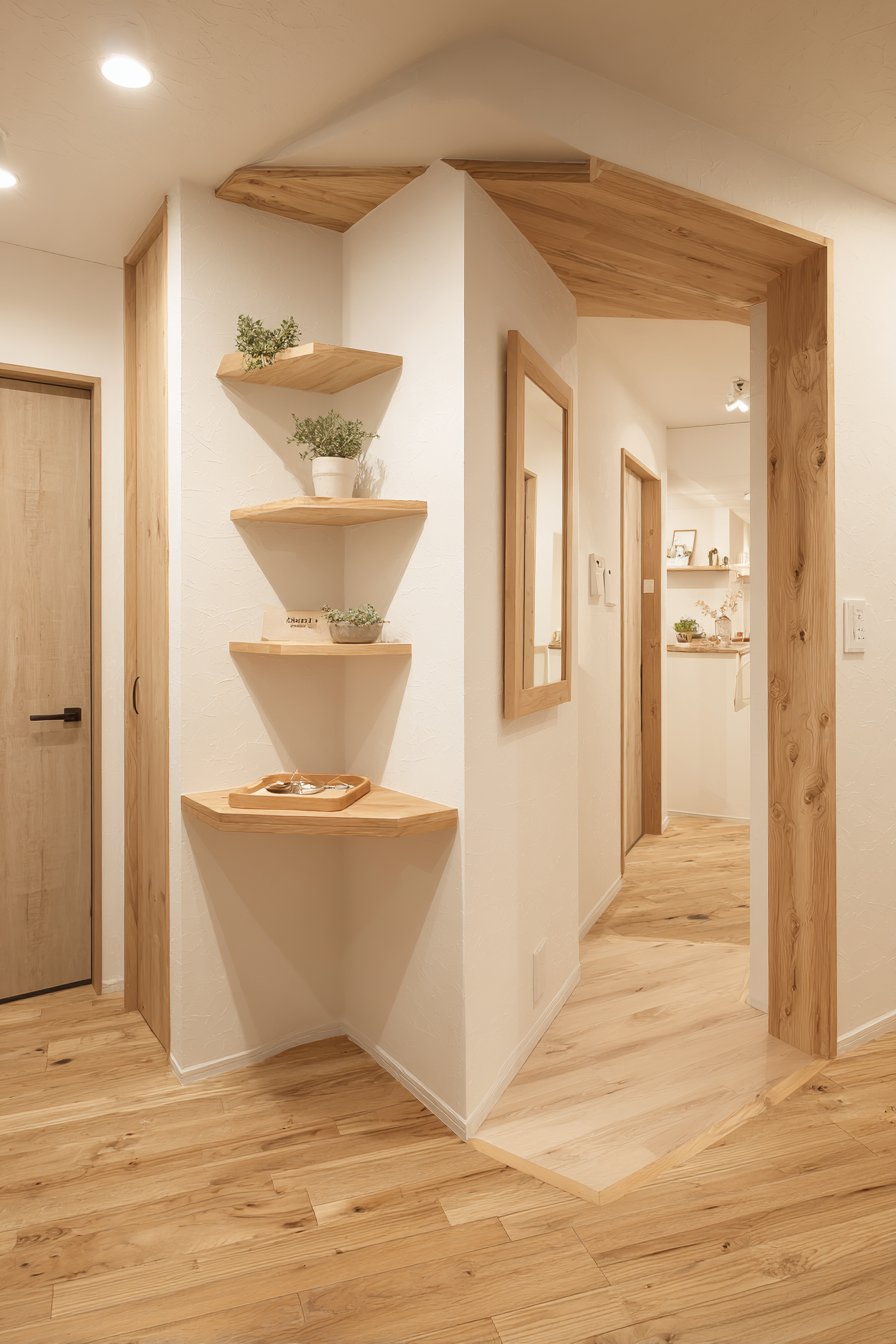 Key Design Tips: Commission custom triangular or corner-fitted furniture to utilize awkward spaces that won’t accommodate standard rectangular pieces. Install wrapped or continuous shelving that follows wall angles to maximize surface area without protruding into walkways. Use corner spaces for mirror placement to capture and reflect light from multiple directions. Select light wood tones to keep corner installations from feeling heavy or overwhelming. Incorporate living plants to add color and life without consuming floor space.