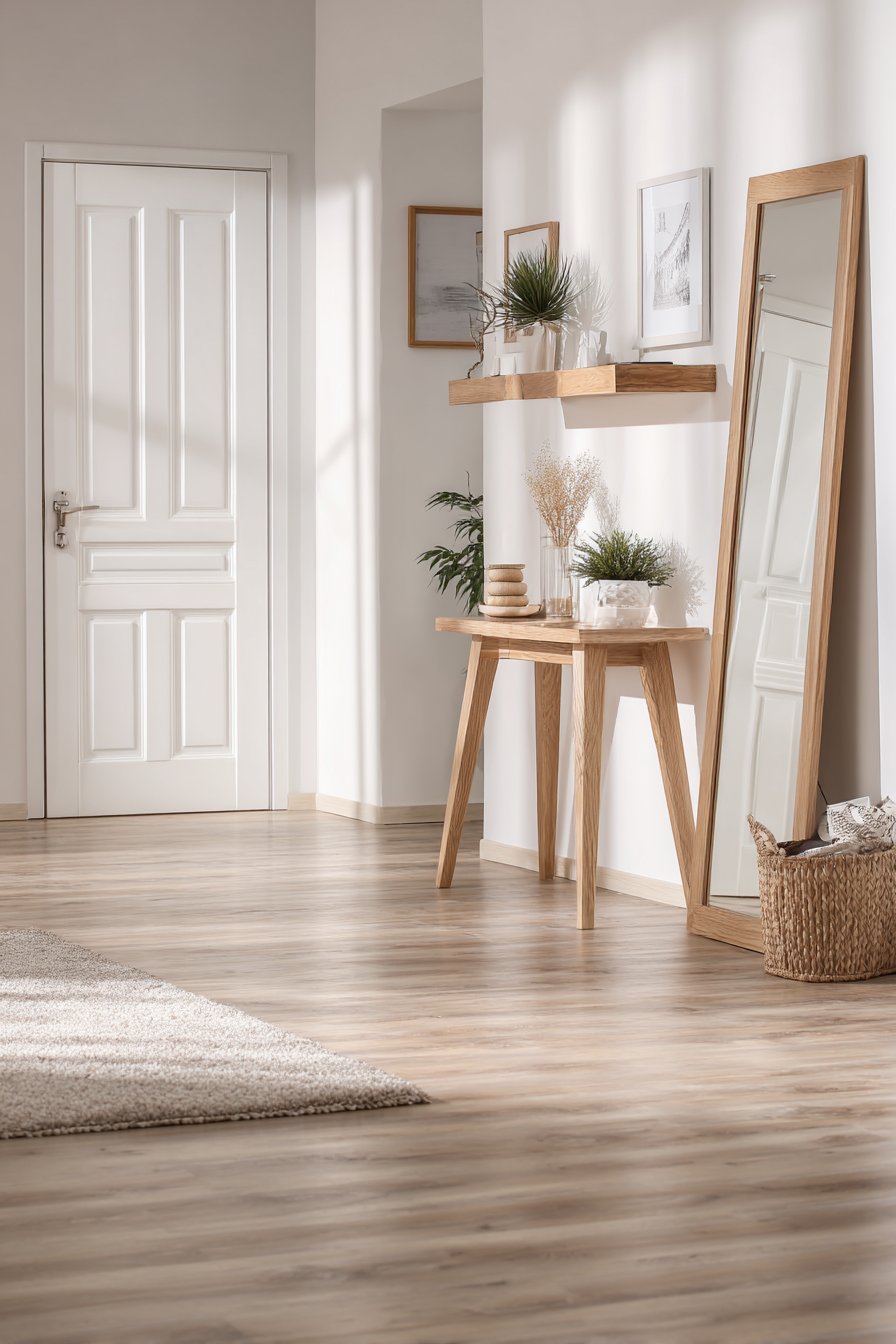 Key Design Tips: Incorporate large mirrors to visually double narrow spaces through reflection and light distribution. Choose leaning mirrors rather than mounted ones for flexibility and a more casual, lived-in aesthetic. Paint floors in light colors to maximize brightness and create visual continuity with walls. Select single-function furniture pieces with minimal footprints to avoid visual clutter. Create designated spots for daily essentials like keys to prevent counter clutter accumulation.