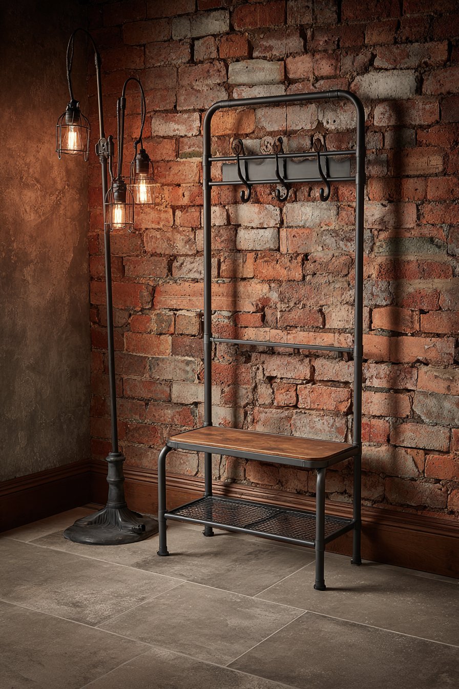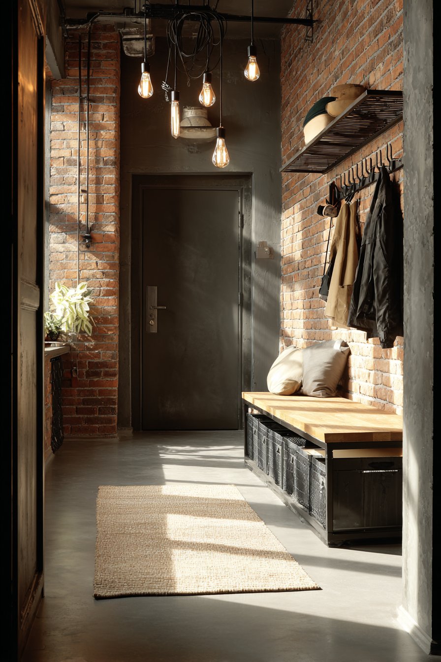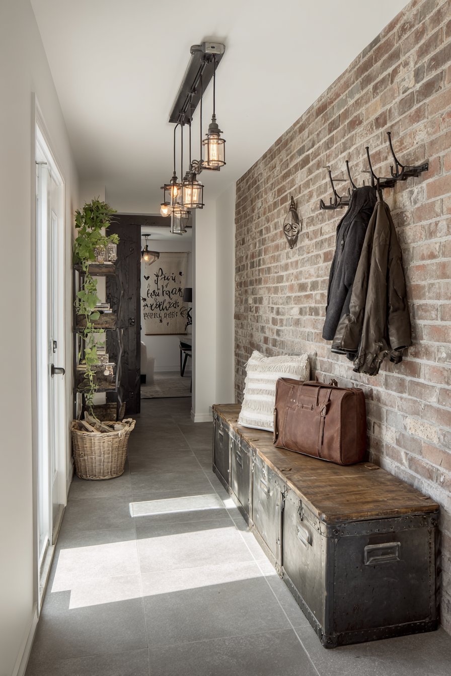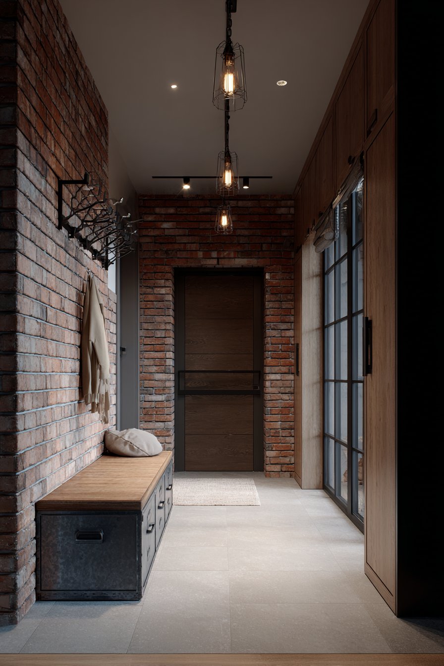 This narrow entryway embraces industrial design’s celebration of raw, honest materials and utilitarian aesthetics. Exposed brick on one wall provides instant texture and character, its warm red-brown tones softening what could otherwise be a harsh industrial palette. The brick’s irregular surface catches light and shadow throughout the day, creating ever-changing visual interest that prevents the narrow space from feeling static or monotonous.