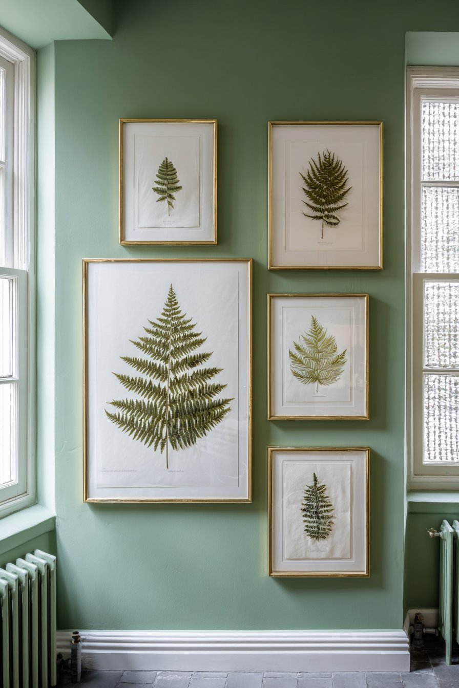 Picture a narrow 16-inch wall section nestled between two windows, transformed into a sophisticated botanical display that brings nature’s elegance indoors. Five carefully curated frames, each containing pressed fern and leaf specimens, ascend the wall in a deliberate progression of sizes. The white matting creates breathing room around each delicate botanical, while thin gold borders add just enough refinement without overwhelming the organic subjects. Against a soft sage green wall, this arrangement creates a cohesive story about bringing the outdoors in, with each frame contributing to a larger narrative about natural beauty and scientific curiosity.