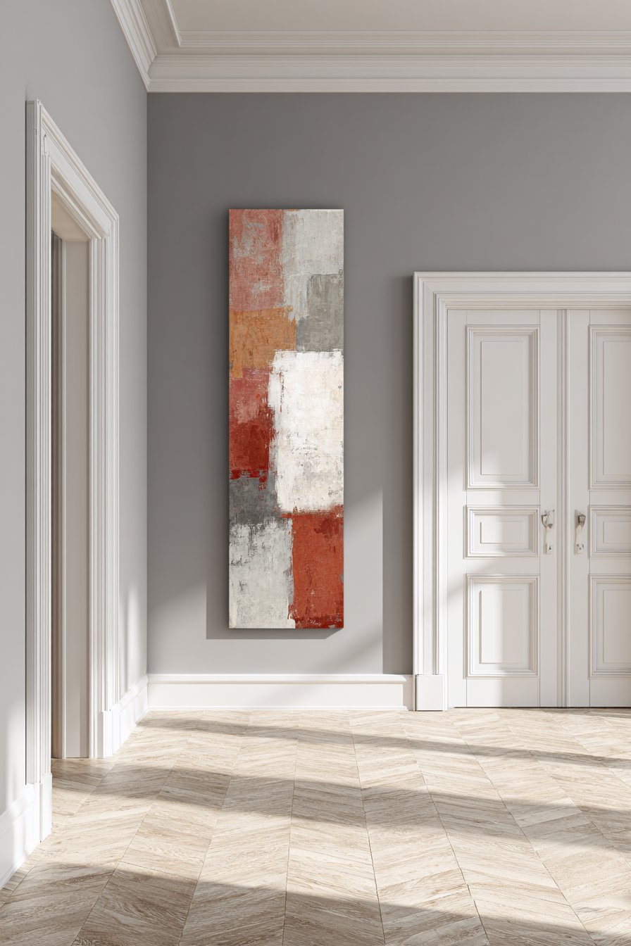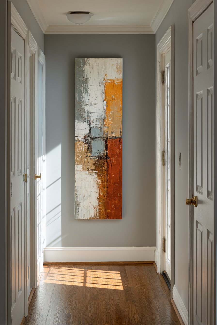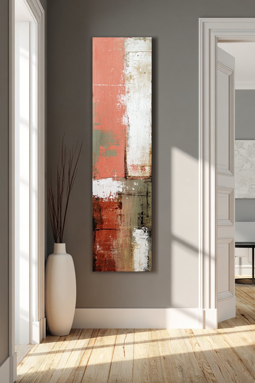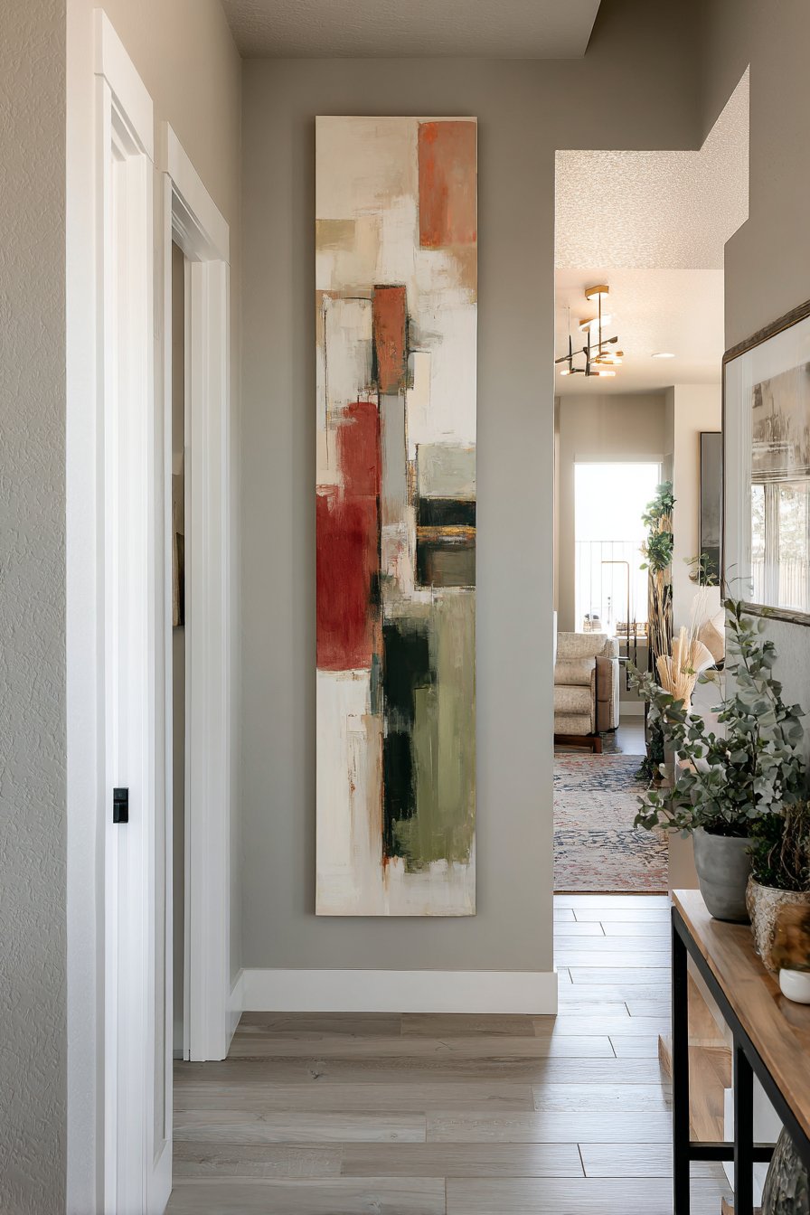 A single oversized vertical painting in muted earth tones makes a bold statement on a narrow 16-inch wall between two doorways, proving that sometimes the simplest solution is the most effective. The 12×60 inch canvas features minimalist brushstrokes in terracotta, sage green, and cream—colors that create soothing harmony while providing enough visual interest to command attention. The vertical format perfectly complements the narrow wall’s proportions, creating a window-like effect that draws the eye upward and makes ceilings feel higher. Against soft gray walls, the artwork’s earth tones create warm contrast that grounds the space with natural elegance.
