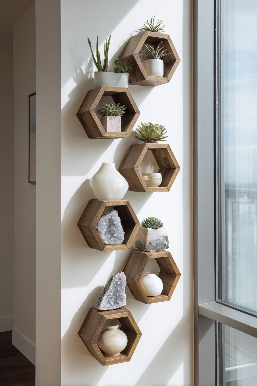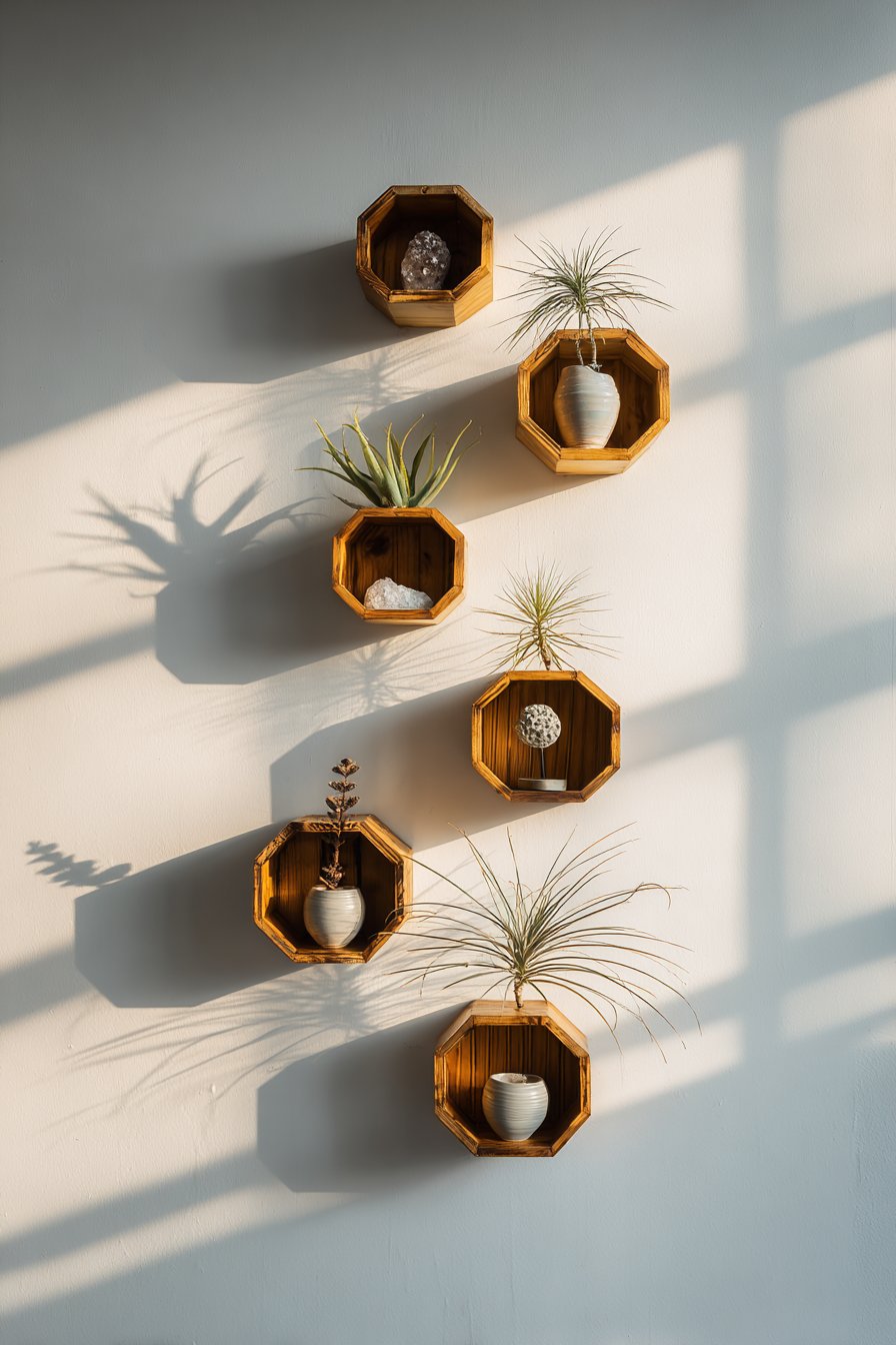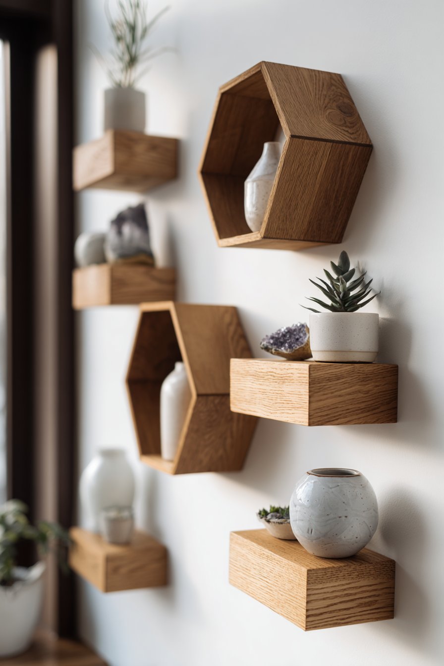 • Limit displayed objects to 2-3 items per shelf to avoid visual clutter on narrow walls