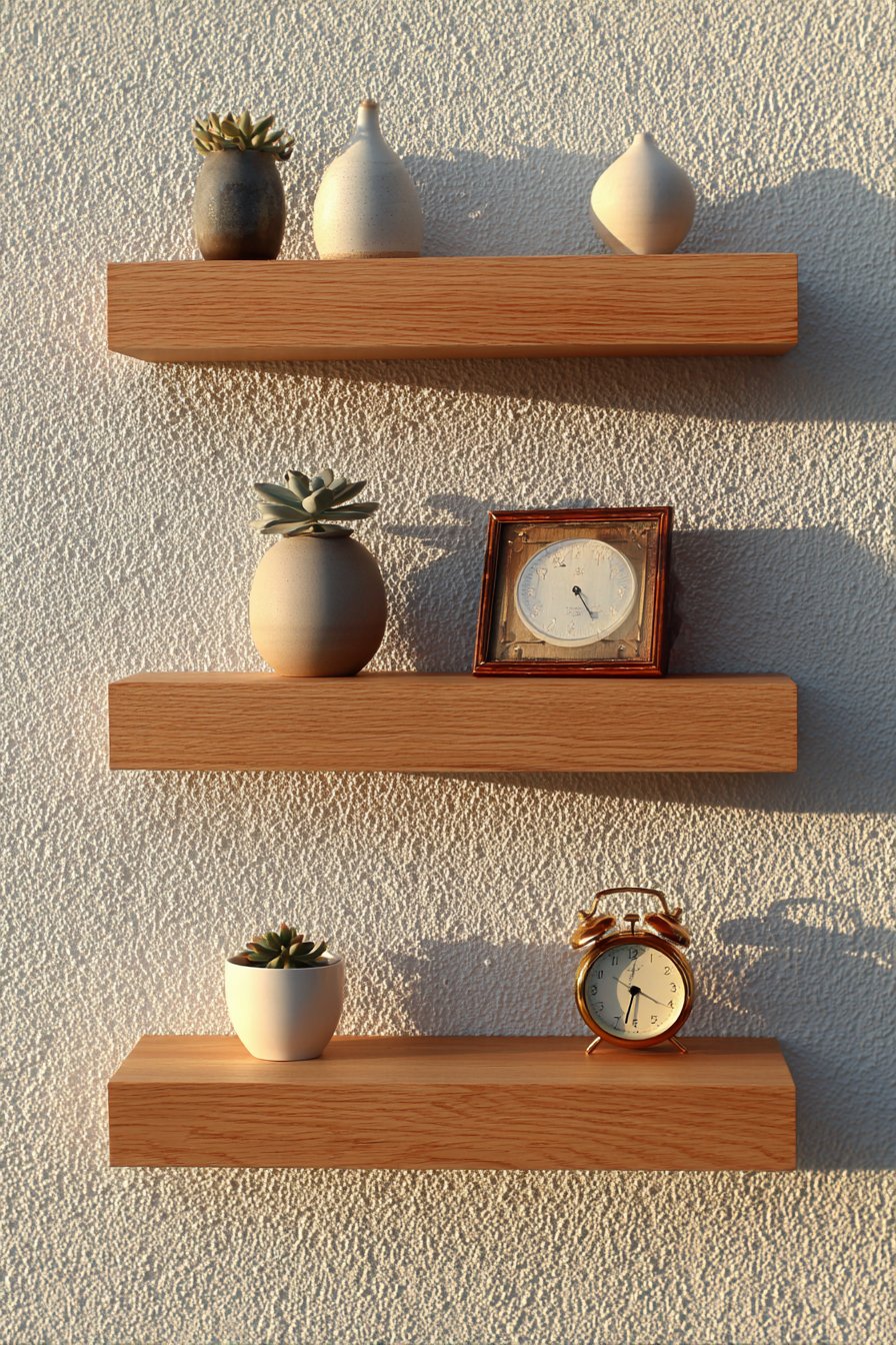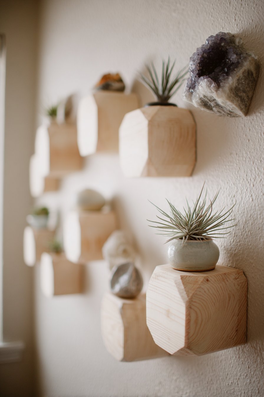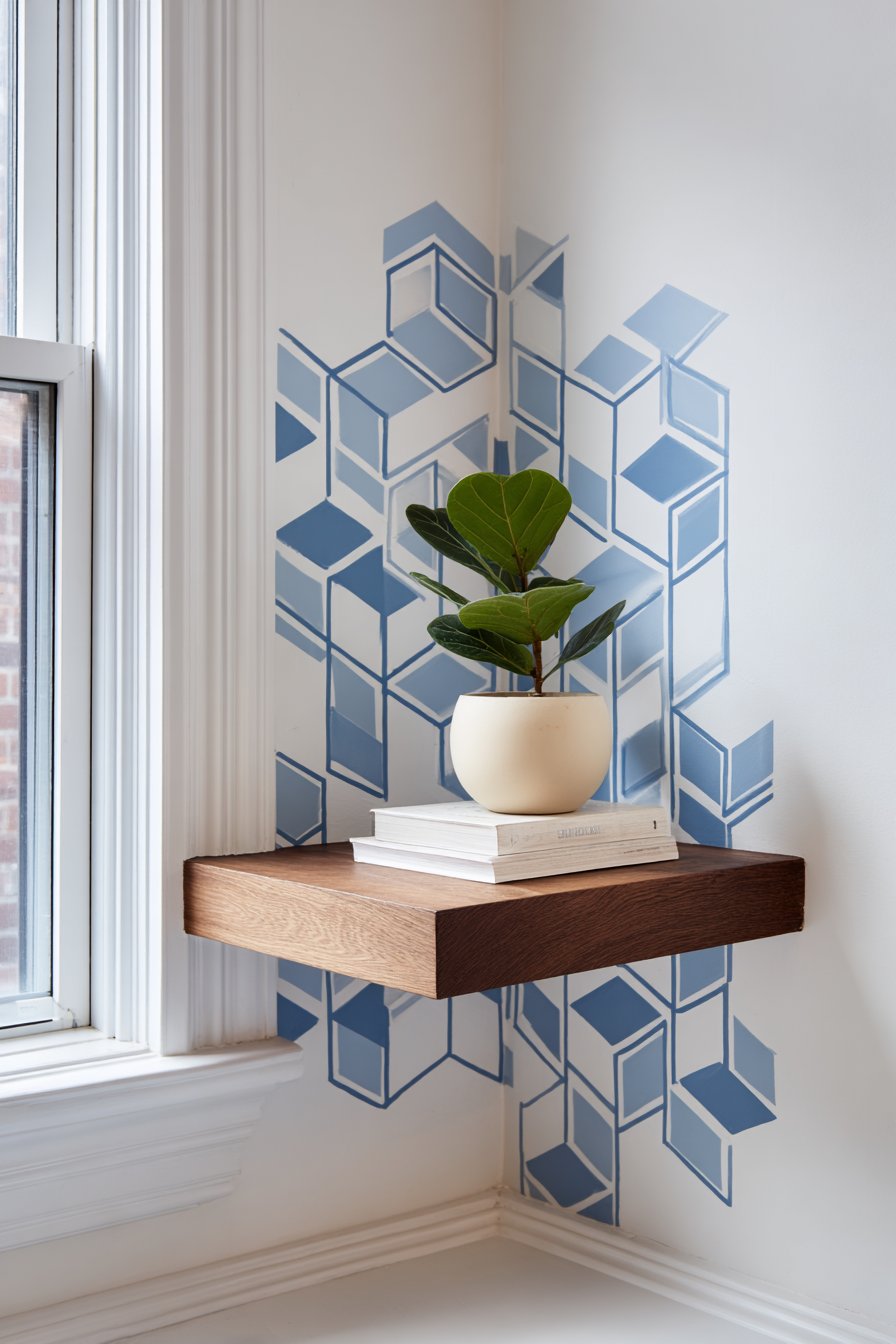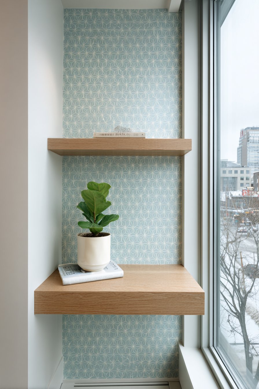 • Limit displayed objects to 2-3 items per shelf to avoid visual clutter on narrow walls