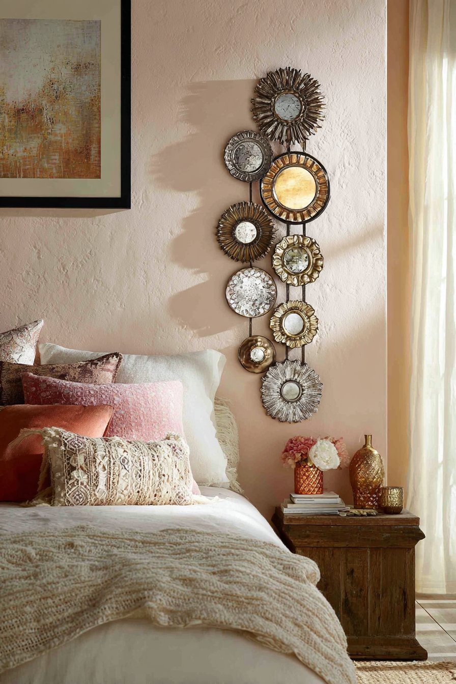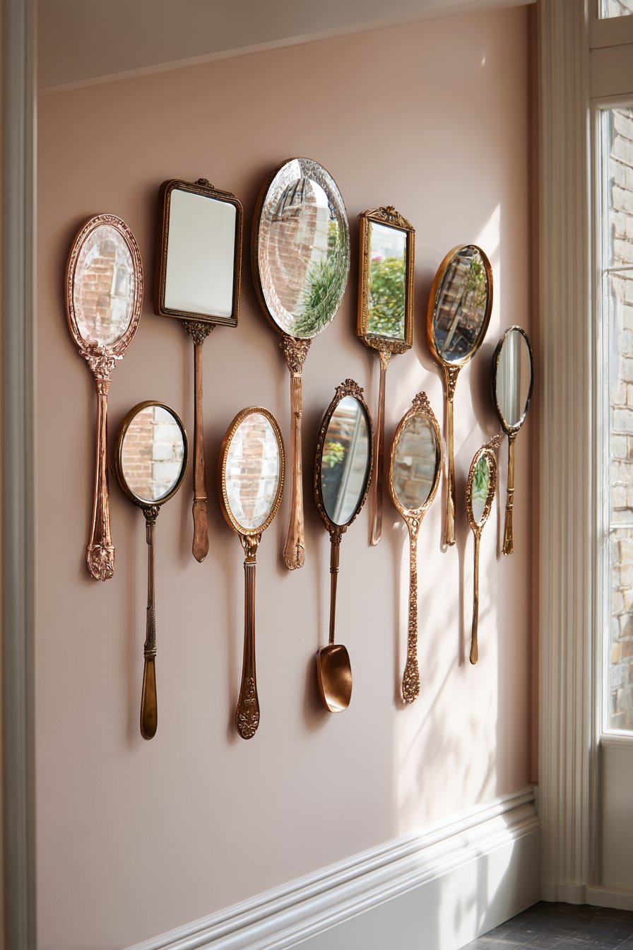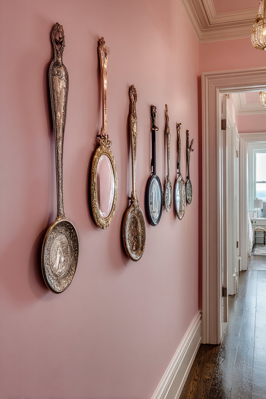 This solution works particularly well in bohemian, coastal, or Scandinavian-inspired interiors, but its neutral palette allows it to adapt to various styles. The vertical arrangement makes ceilings feel higher—a valuable trick in narrow hallways or compact spaces—while the mirrors themselves create the illusion of greater width through their reflective properties. It’s a perfect example of how narrow walls can showcase collections that would feel cramped elsewhere.