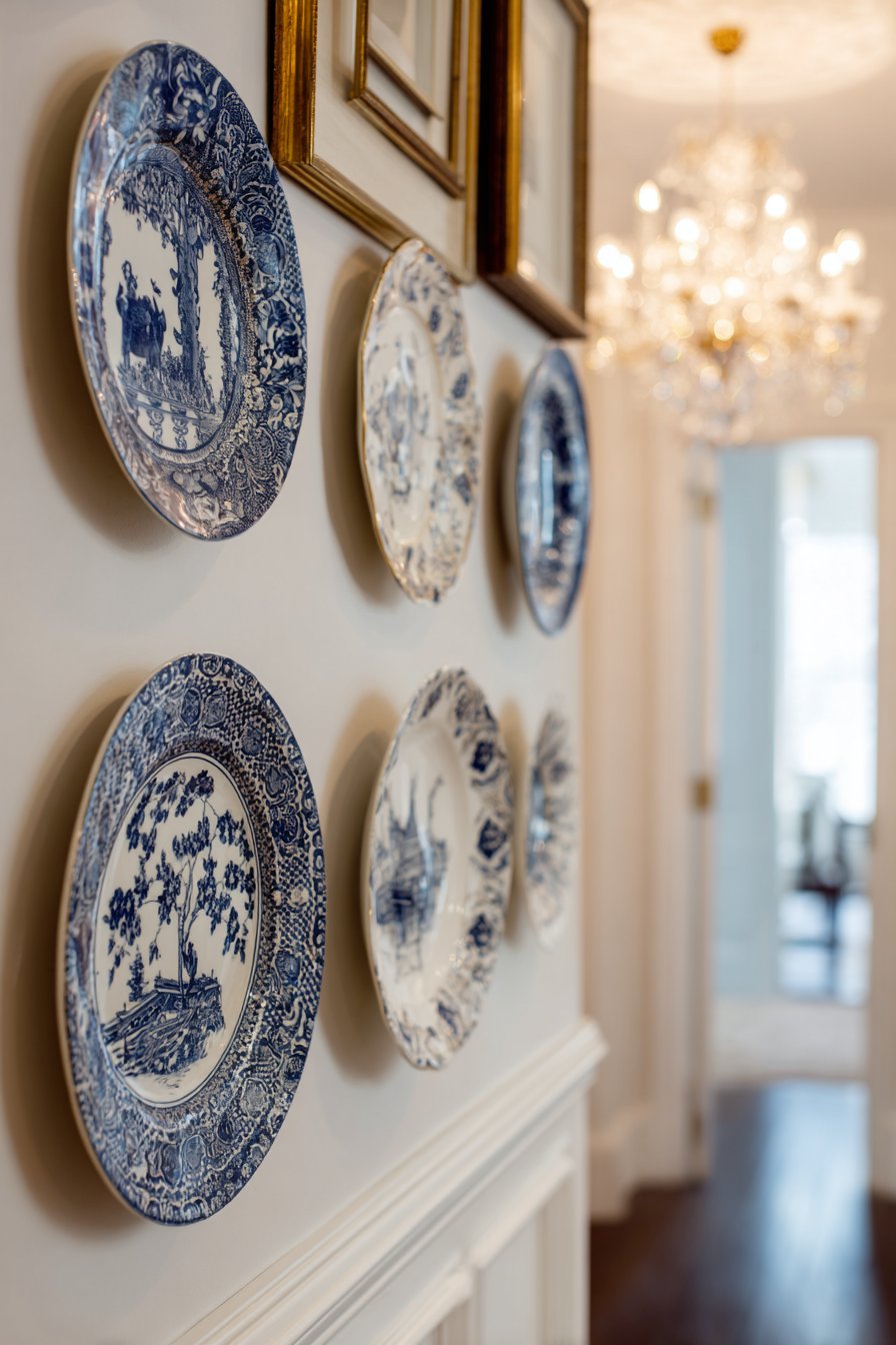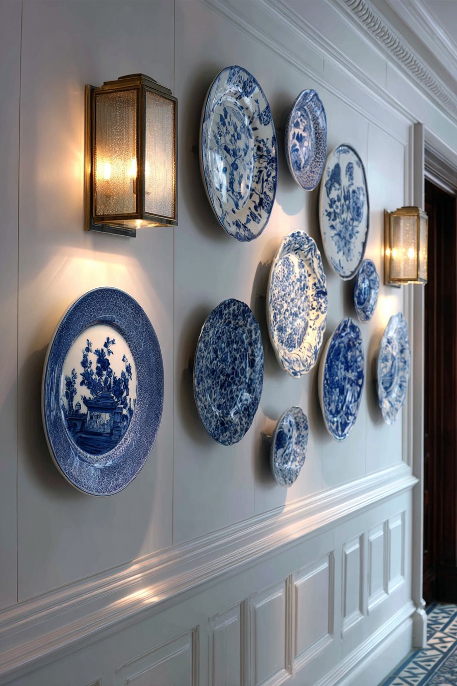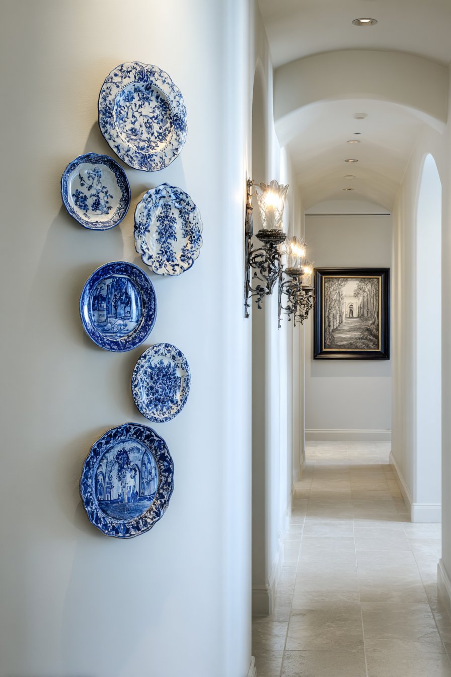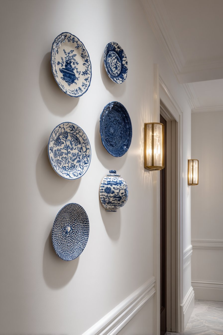 Plate walls have decorated homes for centuries, representing a collecting tradition that spans cultures from English country manors to Chinese ceramics enthusiasts. On narrow walls, plates offer unique advantages—their circular shapes create soft contrast against rectangular architecture, while their thin profiles keep the display from protruding awkwardly. The blue and white palette is eternally classic, coordinating with countless design styles from traditional to transitional to coastal. Each plate becomes a miniature work of art, its patterns and motifs inviting close inspection while contributing to the larger composition.