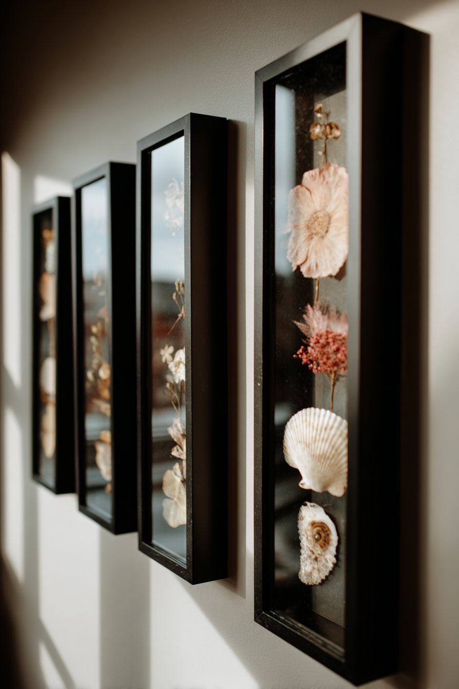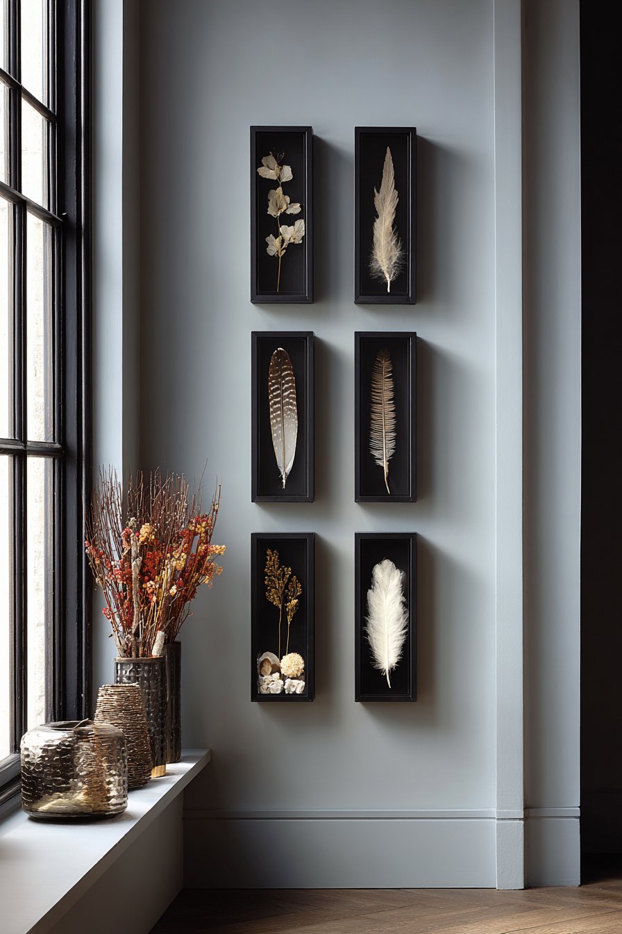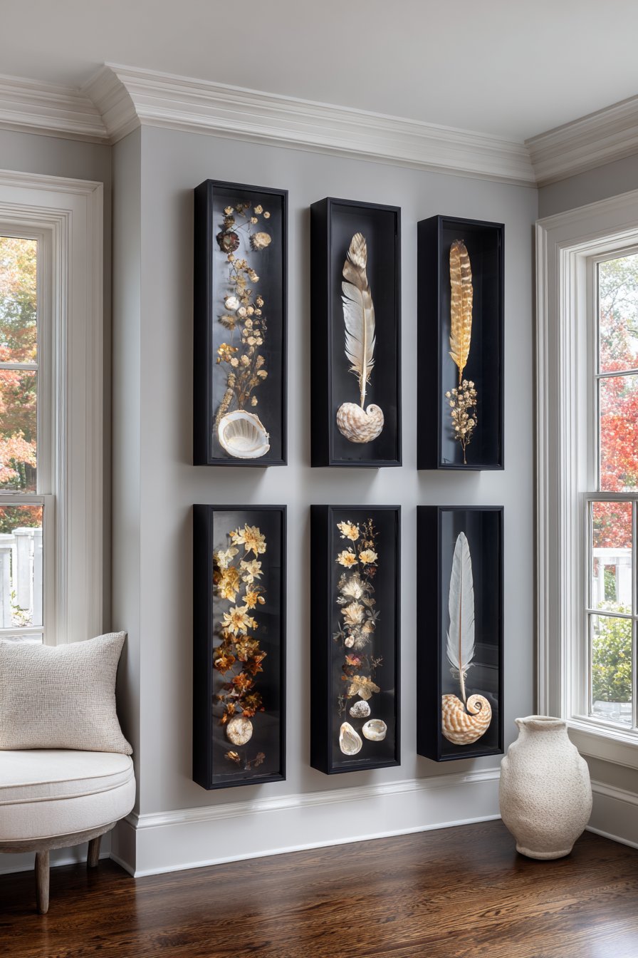Four 8×8 inch black shadow boxes create a nature-inspired vertical gallery on a 15-inch narrow wall, each containing carefully preserved natural specimens—pressed flowers, delicate feathers, collected shells, and dried botanical specimens. These three-dimensional displays transform found objects into art, celebrating natural beauty through thoughtful curation and preservation. The black frames create strong graphic presence against soft gray walls while providing dark backgrounds that make the pale specimens pop with dramatic contrast. Natural window light streams across the display, highlighting delicate details and creating depth within the shadow boxes that emphasizes their dimensional quality.