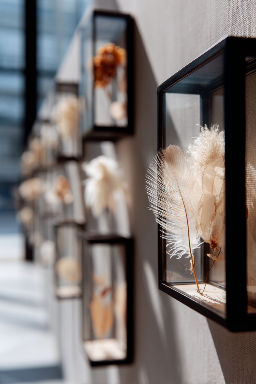 This type of narrow wall treatment works particularly well in spaces where you want to create interest without adding visual weight. The transparency of the white matting and the delicate nature of the pressed botanicals keep the display feeling light and airy rather than cluttered. It’s a perfect solution for hallways, breakfast nooks, or any transitional space where you want to add personality without overwhelming the senses.