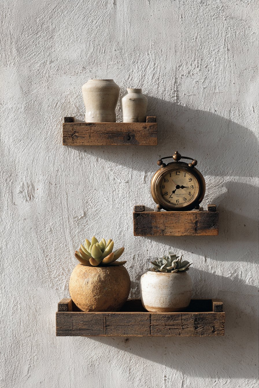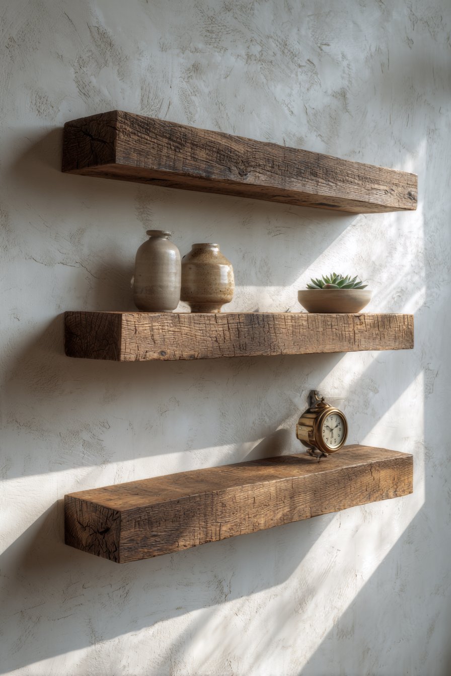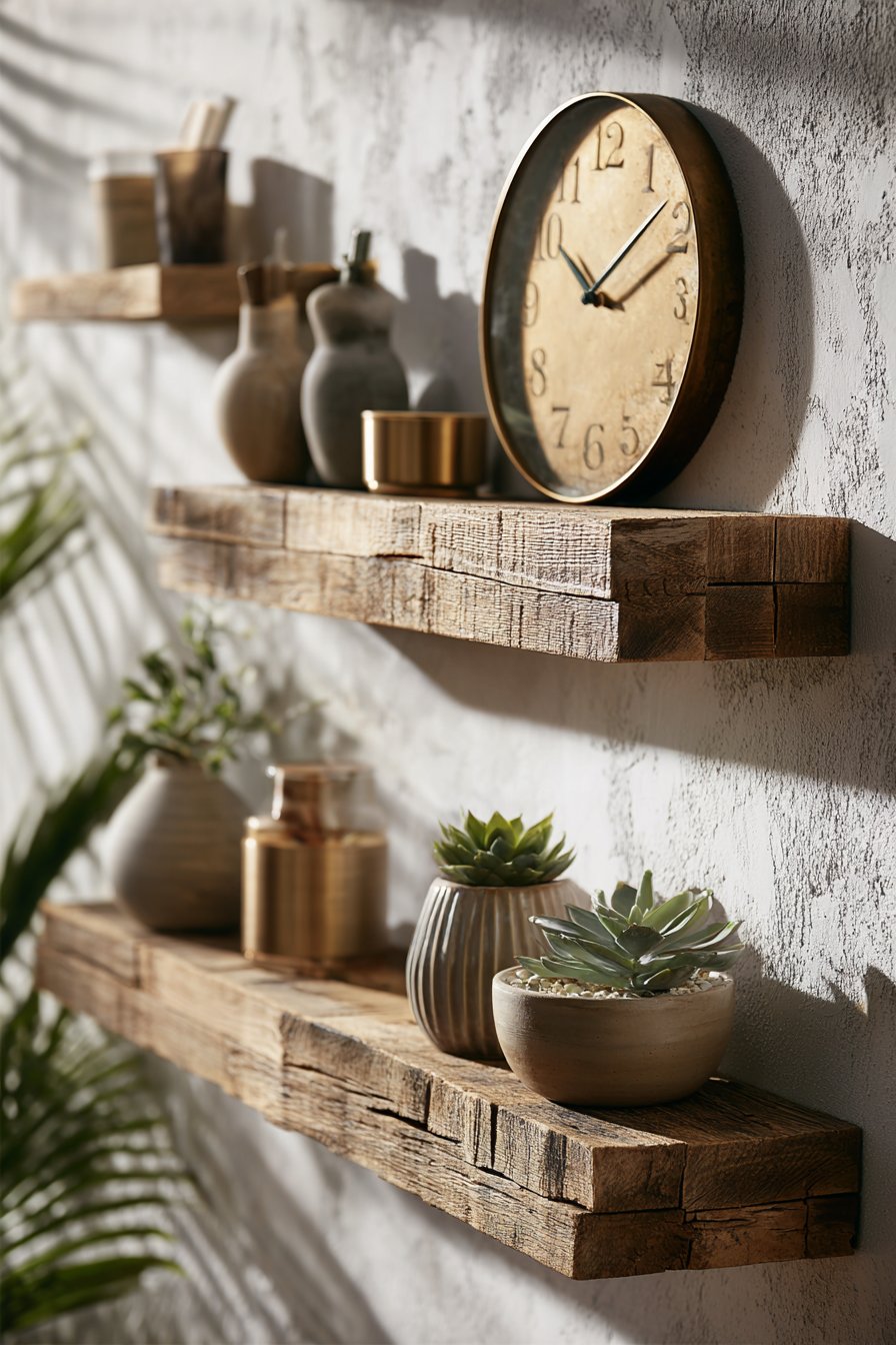 A narrow entryway wall becomes a story of sustainable design with three staggered floating shelves crafted from reclaimed barnwood. Each 8-inch deep shelf showcases the wood’s authentic history—visible grain patterns, natural color variations, and the gentle patina of age. The arrangement isn’t uniform; shelves are positioned at thoughtfully irregular heights, creating visual interest while serving distinct purposes. The top shelf holds a collection of ceramic vessels in soft whites and taupes, their organic shapes echoing the natural quality of the wood. The middle shelf provides a home for a compact succulent arrangement in a handmade pottery container, while the lowest shelf displays a vintage brass clock that adds both function and vintage charm.