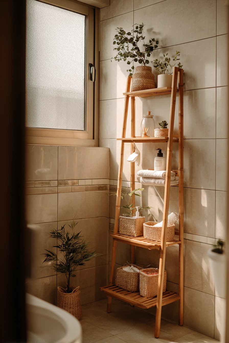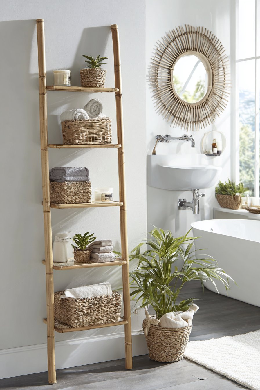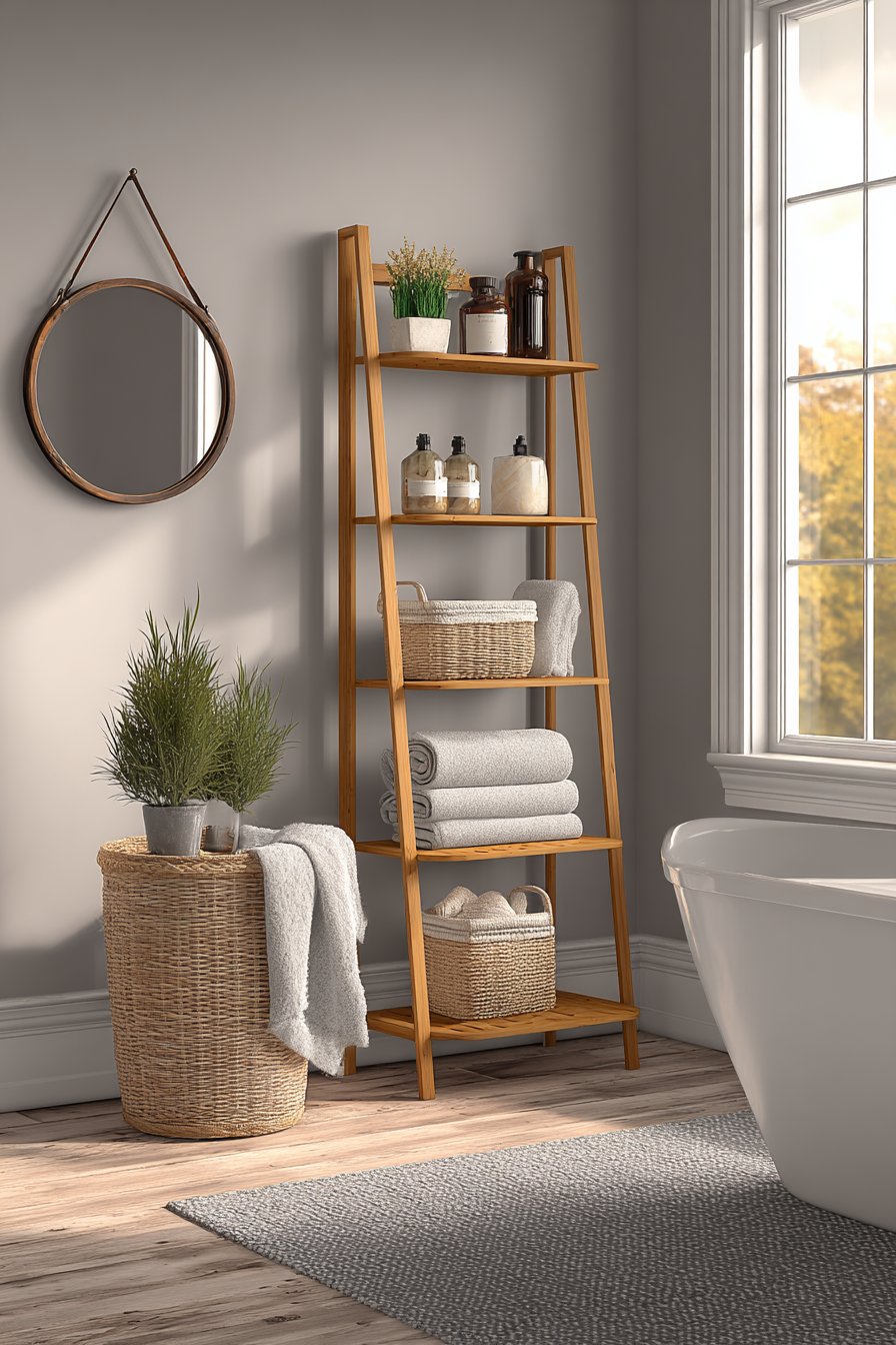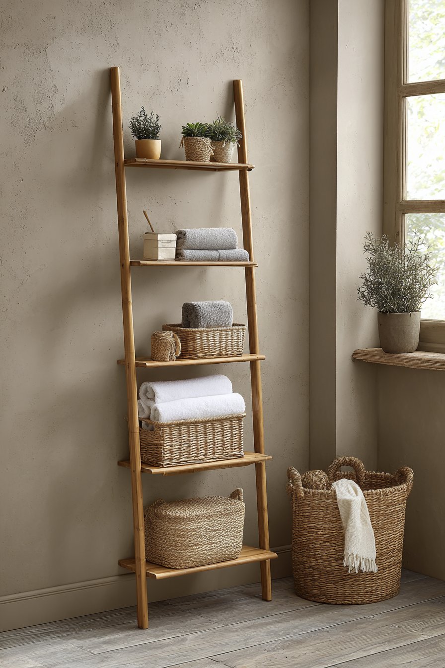 • Choose bamboo or wood ladder shelves for moisture resistance in bathroom environments