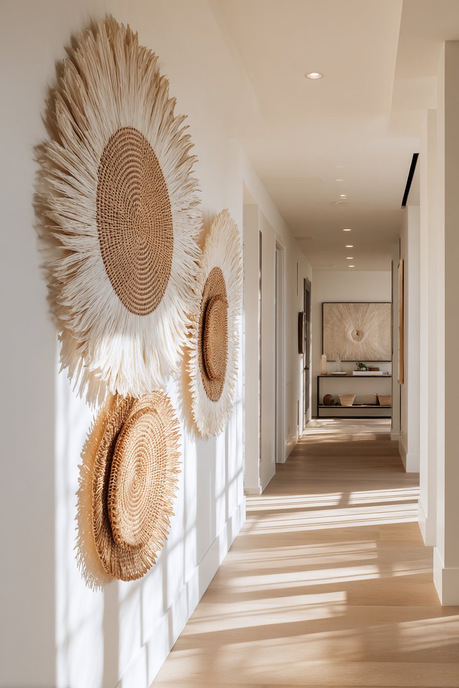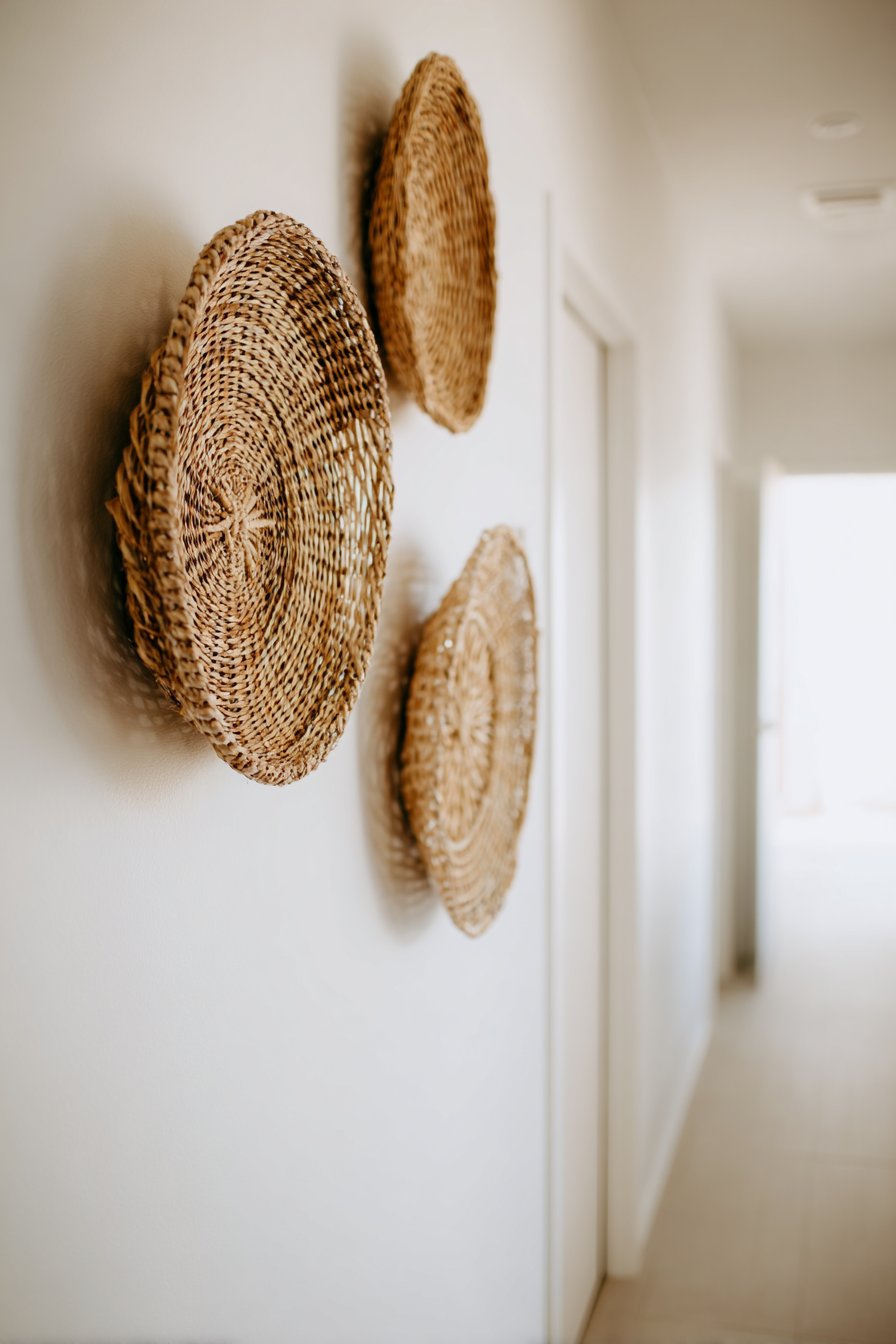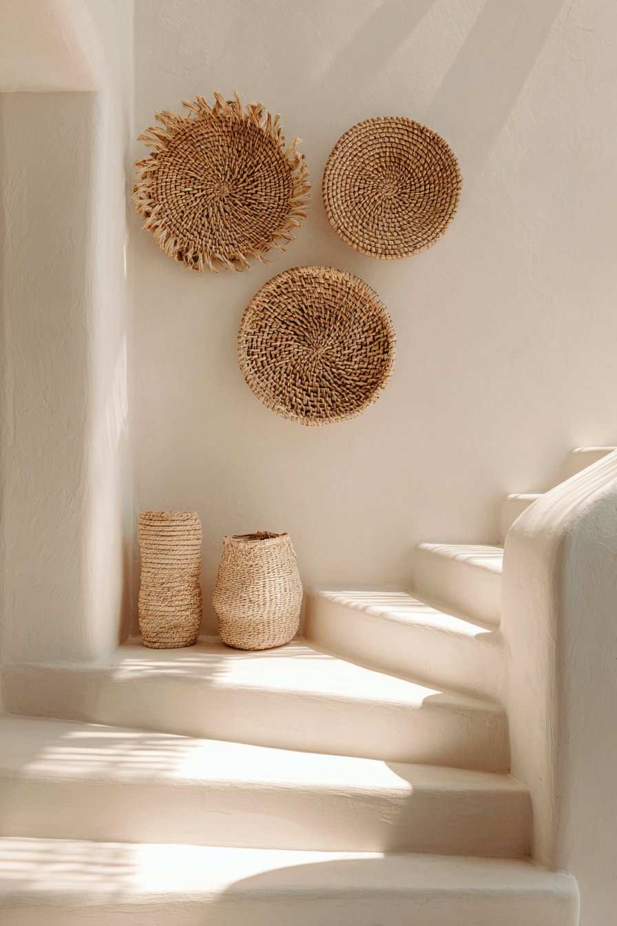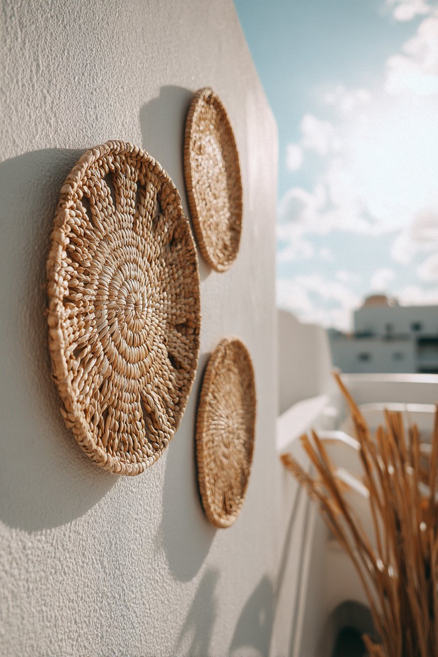 Three seagrass baskets in graduated sizes create bohemian texture on a 14-inch narrow wall, their natural woven patterns adding organic warmth to crisp white walls. The baskets range from 10 to 16 inches in diameter, mounted with even vertical spacing that creates rhythm without rigidity. Each basket’s tightly woven construction creates intricate texture that invites close inspection—the natural color variations in the seagrass create subtle striping, while the handcrafted quality ensures each basket has slight irregularities that prove human craftsmanship. Soft diffused daylight highlights the dimensional weave patterns, with light catching on raised portions while shadows settle into woven valleys.