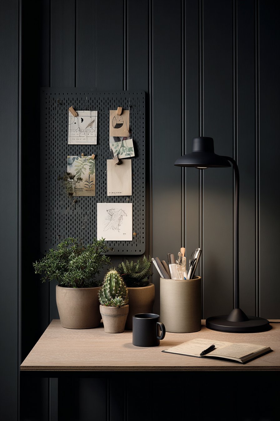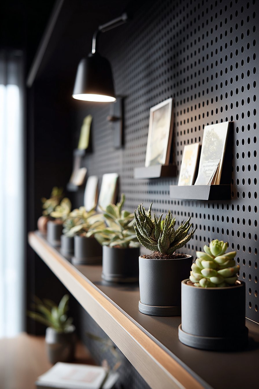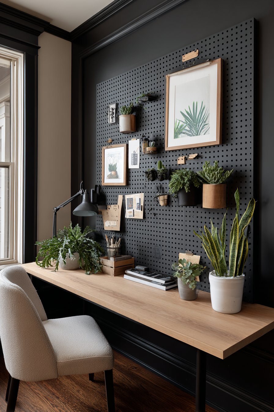 A matte charcoal gray pegboard transforms a narrow 12-inch home office wall into adaptable organization that’s both functional and stylish. Wooden pegs in natural finish create warm contrast against the dark background, holding an ever-changing array of items: small potted succulents in minimal concrete planters, essential office supplies within easy reach, and inspirational postcards that provide creative motivation. The narrow wall becomes a living, breathing organization system that adapts to changing needs—simply move pegs to reconfigure the arrangement. Natural desk lamp lighting creates practical illumination while highlighting the three-dimensional quality of the pegboard’s texture and the objects it displays.