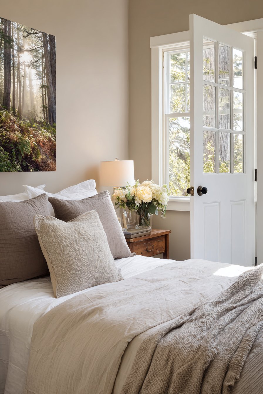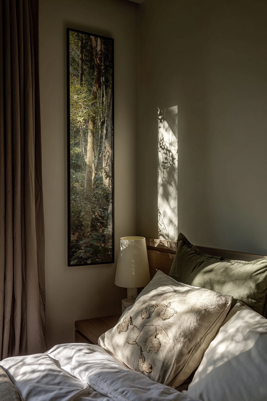 Nature photography has become increasingly popular in interior design as urban dwellers seek to maintain connection with the natural world. Large vertical prints create immersive experiences, particularly when scaled appropriately to the viewing space. On narrow walls, vertical nature scenes work beautifully because they mirror how we actually experience forests—looking up through trees toward the sky—creating intuitive visual relationships. The calming greens and browns provide scientifically proven stress reduction benefits, making this approach particularly valuable in bedrooms where relaxation is paramount.