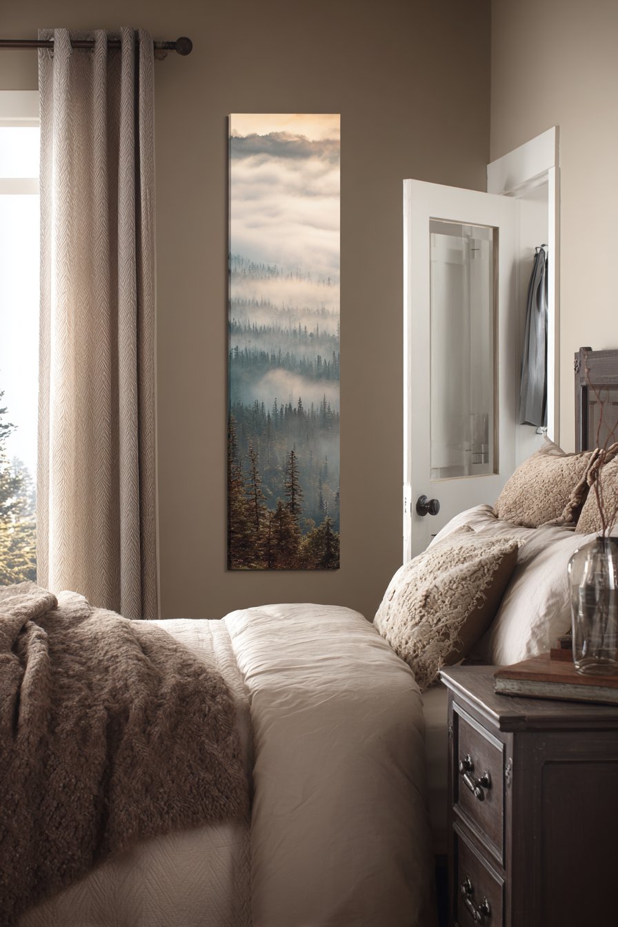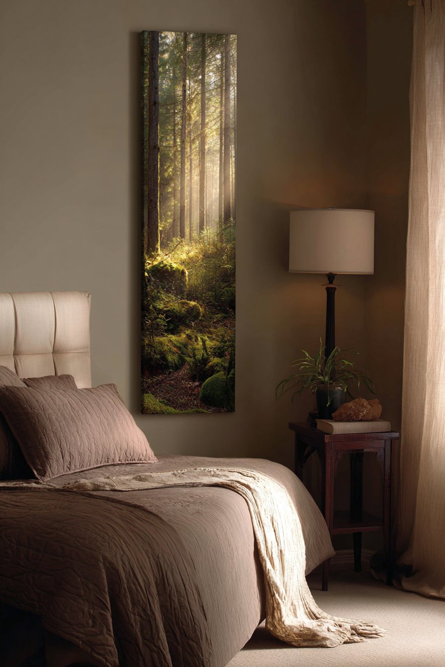 A 16×48 inch vertical nature photograph transforms a narrow bedroom wall into a window to the forest, bringing outdoor serenity indoors through the power of large-scale nature imagery. The muted greens and browns of a peaceful woodland scene create calming atmosphere perfect for bedroom tranquility. Tall trees stretch upward through the vertical frame, their trunks creating strong vertical lines that emphasize the canvas’s height while their leafy canopy softens the top. Against soft taupe walls, the nature print’s earth tones create harmonious color relationships that feel grounded and peaceful. Morning light through bedroom windows creates gentle illumination that makes the forest scene feel alive, as if you could step through the canvas into the woods beyond.