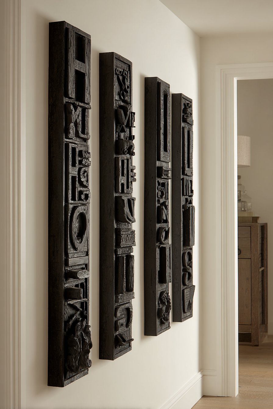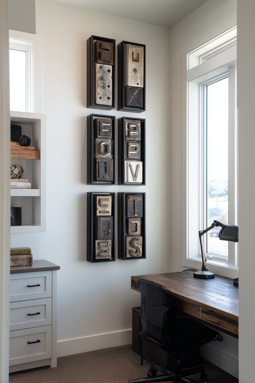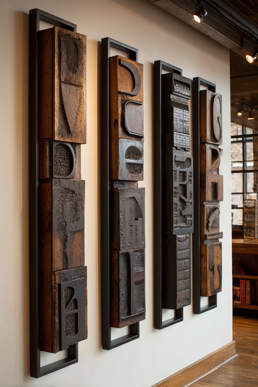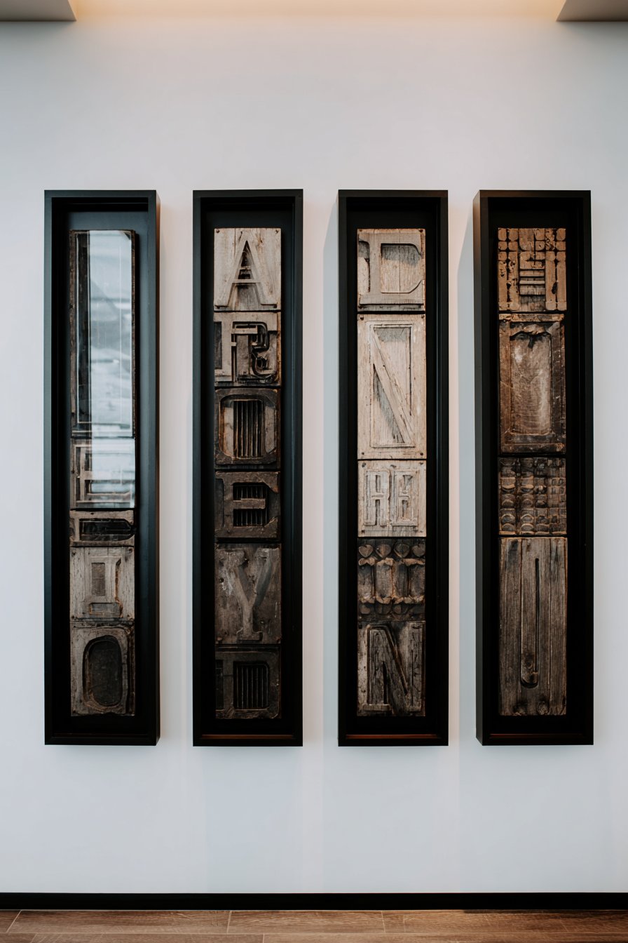 This approach demonstrates how repurposed objects can become art through thoughtful presentation. The museum-quality framing elevates utilitarian printing blocks to gallery-worthy pieces, while the narrow wall provides the perfect scale for displaying them without overwhelming. It’s an solution that appeals to designers, writers, and anyone who appreciates typography’s visual power and historical significance.