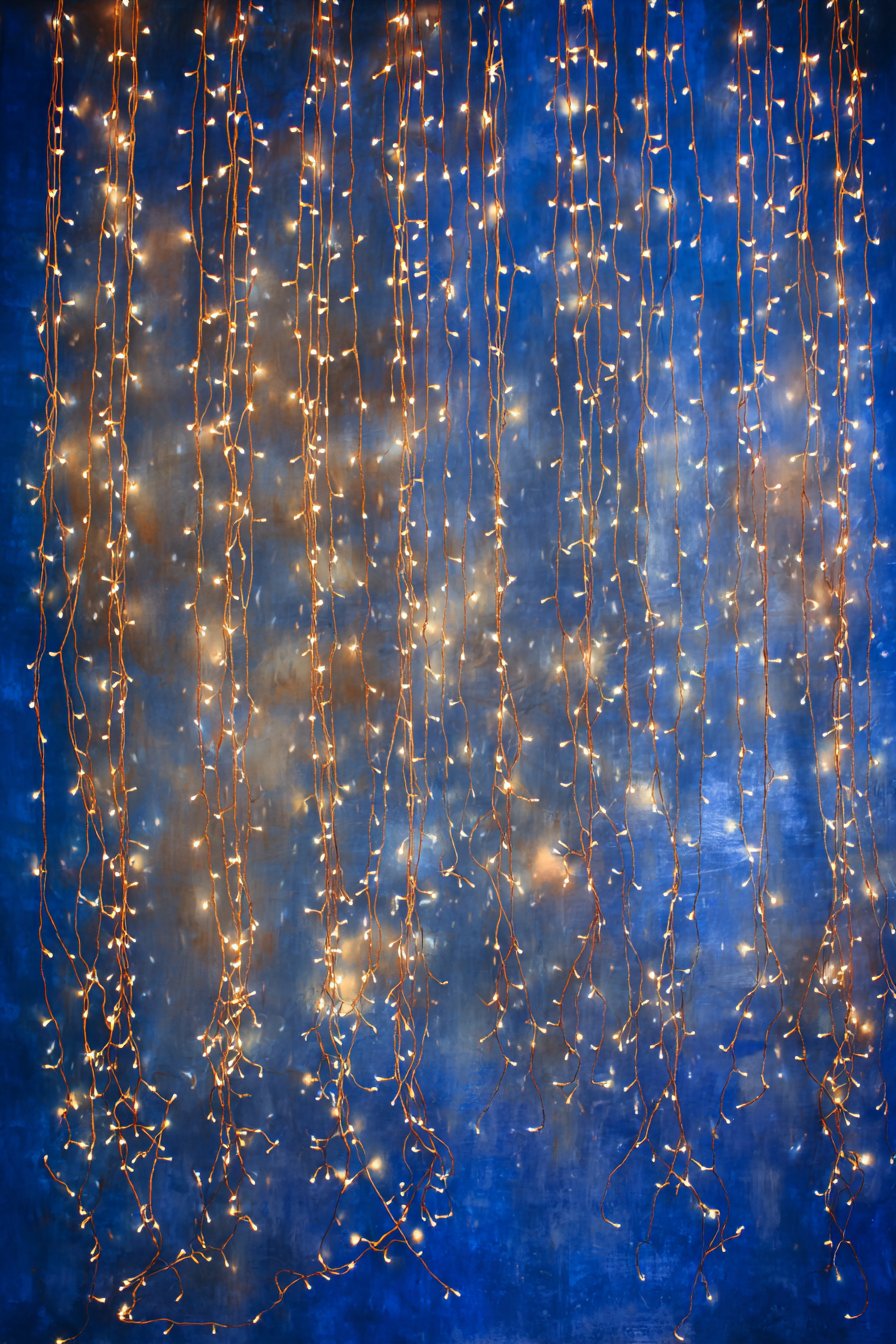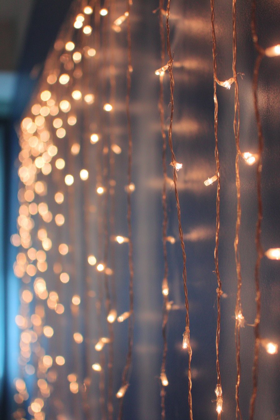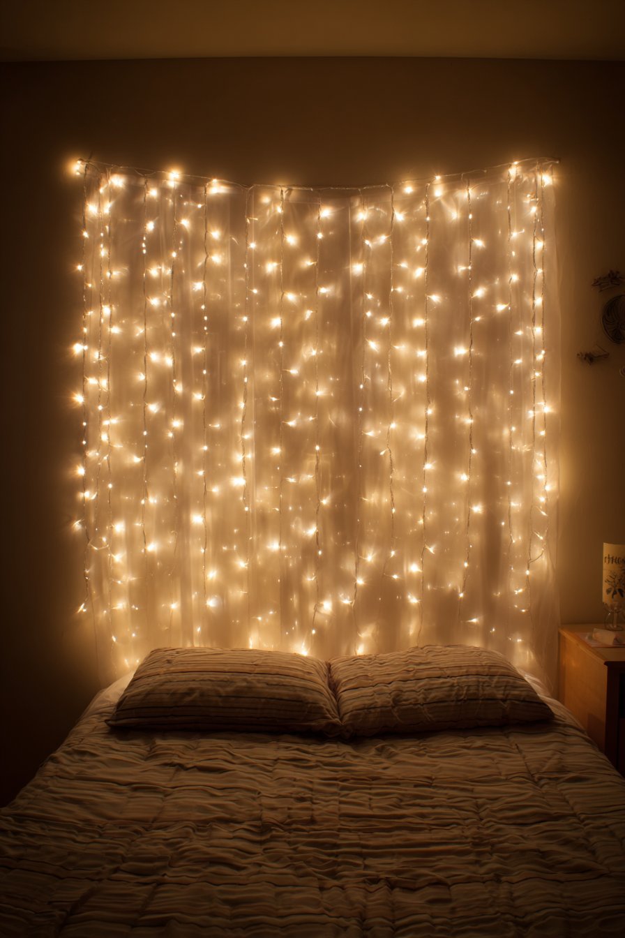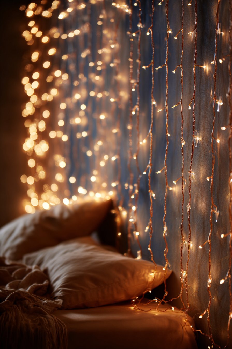 Delicate copper wire fairy lights create magical ambient lighting on a narrow 16-inch wall behind a bed headboard, arranged in vertical cascading lines secured with small clear hooks. Tiny warm white LED lights twinkle like captured stars against deep navy walls, creating ethereal atmosphere that transforms the narrow wall into a luminous focal point. The copper wire virtually disappears in daylight, leaving only the small LED points visible, but evening brings transformation as the lights glow softly, casting gentle ambient illumination that creates romantic, restful mood perfect for bedrooms. The vertical cascading arrangement draws eyes upward while the narrow width ensures the installation enhances rather than overwhelms the space.