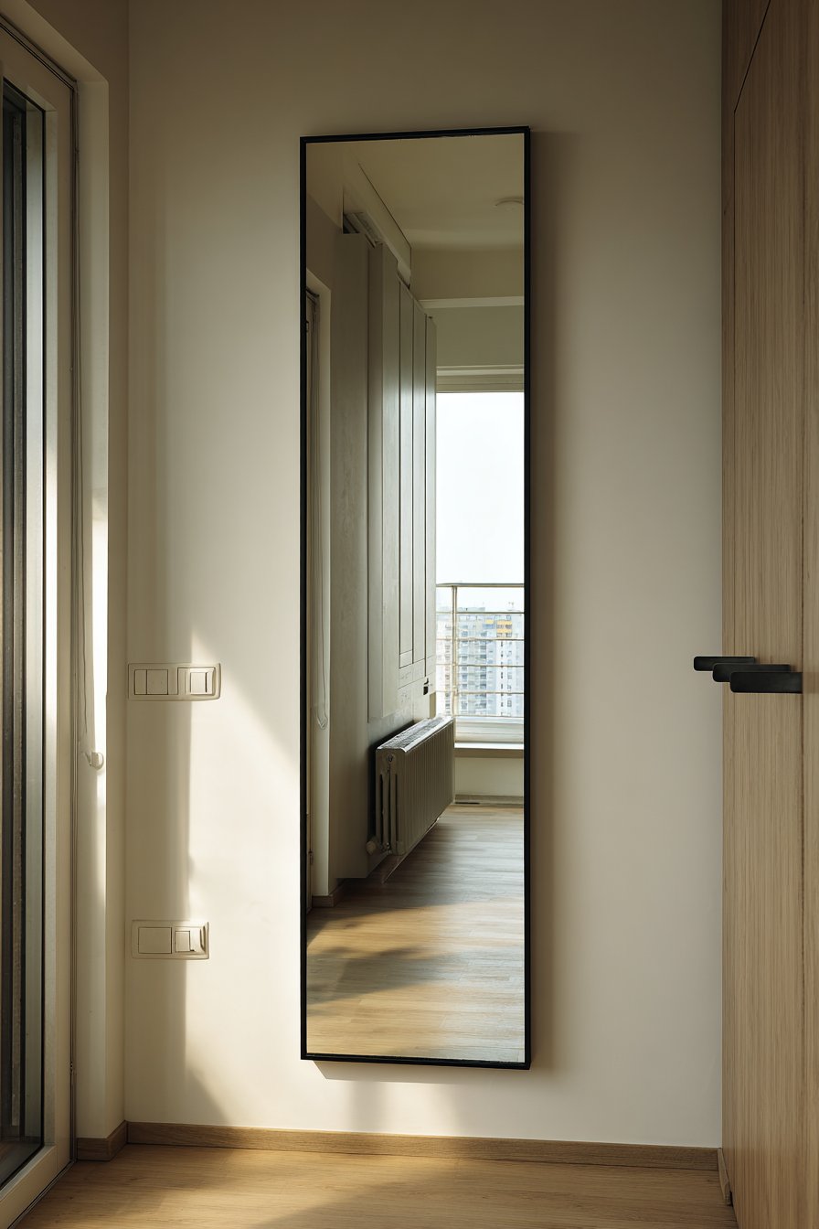 This solution addresses one of the most common challenges in apartment living: how to make narrow, dark hallways feel more spacious and welcoming. The mirror accomplishes this through pure optical trickery, reflecting the space back on itself and creating depth where none physically exists. The black metal frame grounds the mirror visually while maintaining clean, modern lines that don’t overwhelm the narrow wall. The matte finish prevents the frame from being too shiny or distracting, keeping focus on the reflective surface itself.