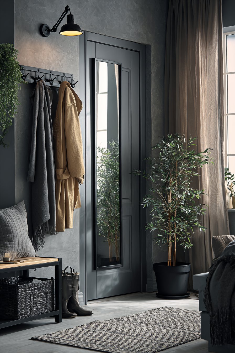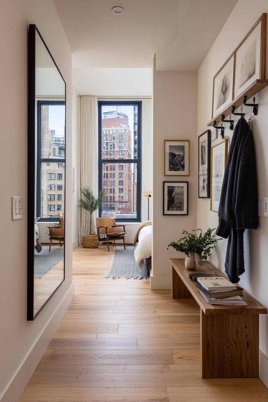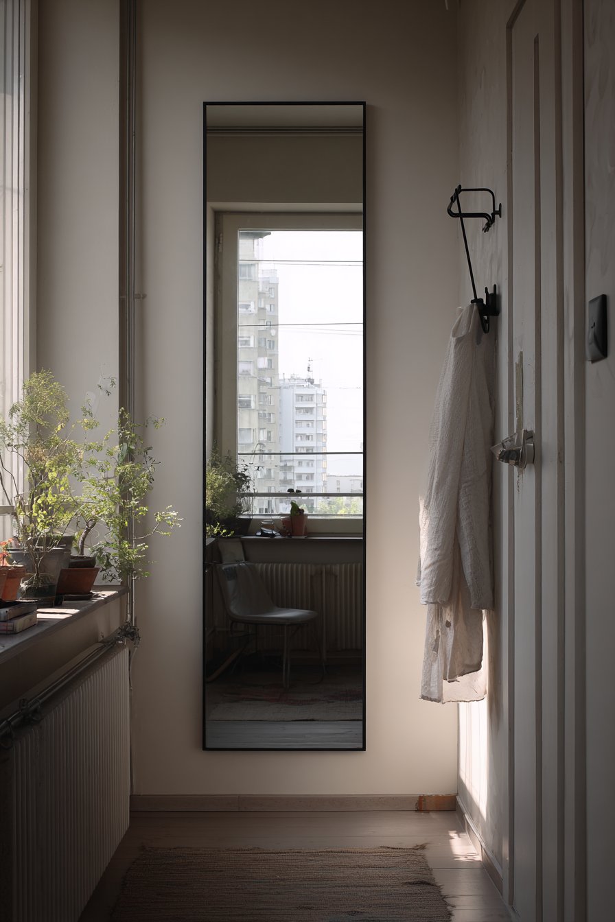 Transform a cramped hallway with a floor-to-ceiling mirror installation on a mere 14-inch wide wall strip, creating an optical illusion that fundamentally alters spatial perception. The full-length mirror, enclosed in a simple black metal frame, performs double duty by both decorating and functionally expanding the space. Its reflective surface captures light from an opposite window, bouncing illumination throughout the hallway and effectively doubling the perceived width of the narrow corridor. At the base, a practical touch—a small wall-mounted hook rail in matte black—provides convenient hanging space for bags, scarves, or dog leashes without compromising the mirror’s visual impact.